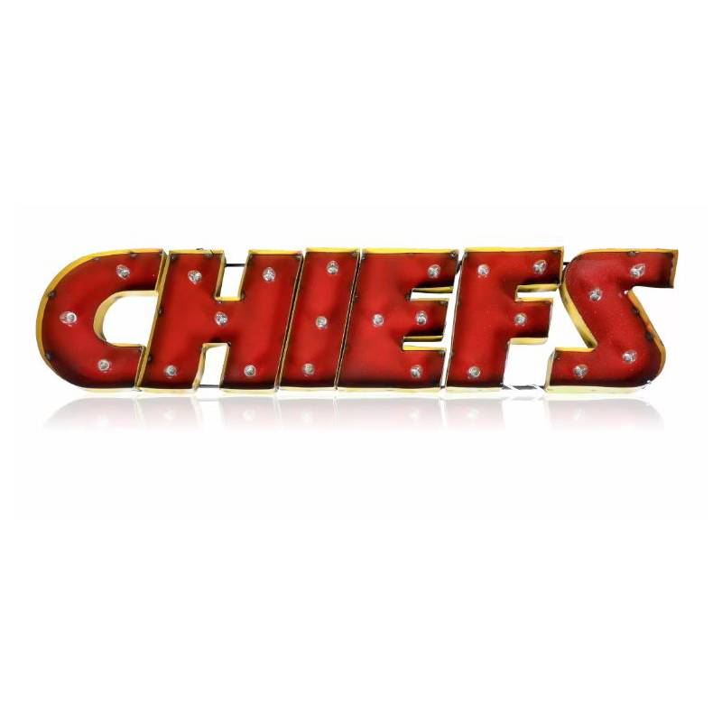 Light up your home or fan cave with the Imperial Kansas City Chiefs Recycled Lighted Sign. Suitable for indoor or outdoor use, this sign is built by hand from recycled metals and includes light strands with clear, incandescent C7 glass bulbs. An authentic style décor piece, the sign features channel lettering and exposed weld spots for a unique, rustic look.