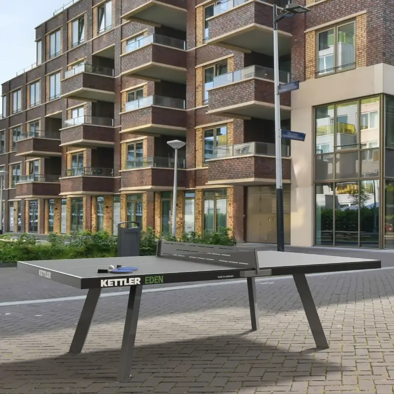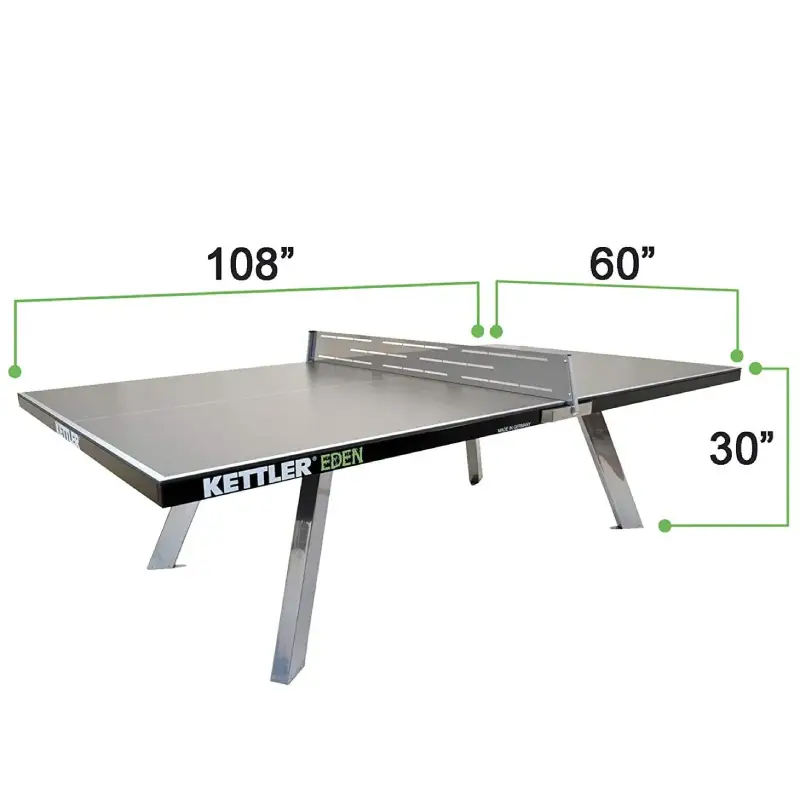 Assembly requires only 16 bolts to attach legs to the table frame. Kettler backs the Eden with a 10-year limited warranty on the tabletop and a 3-year warranty on other components. The bold blue top enhances visual contrast for both players and spectators. Made in Germany, this table is ideal for home patios, parks, resorts, or any outdoor recreation setting where permanence and performance matter.