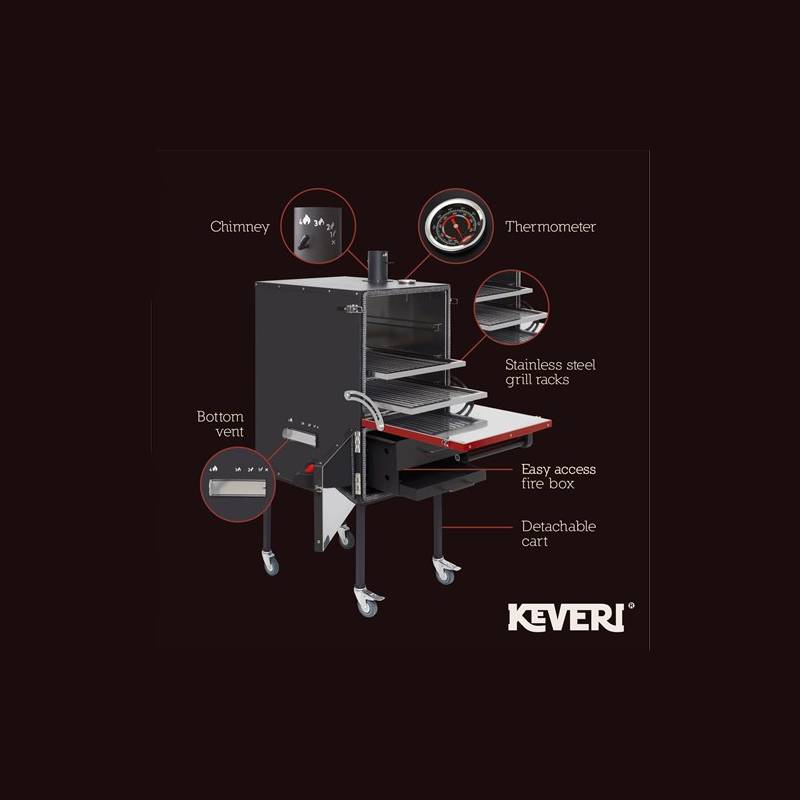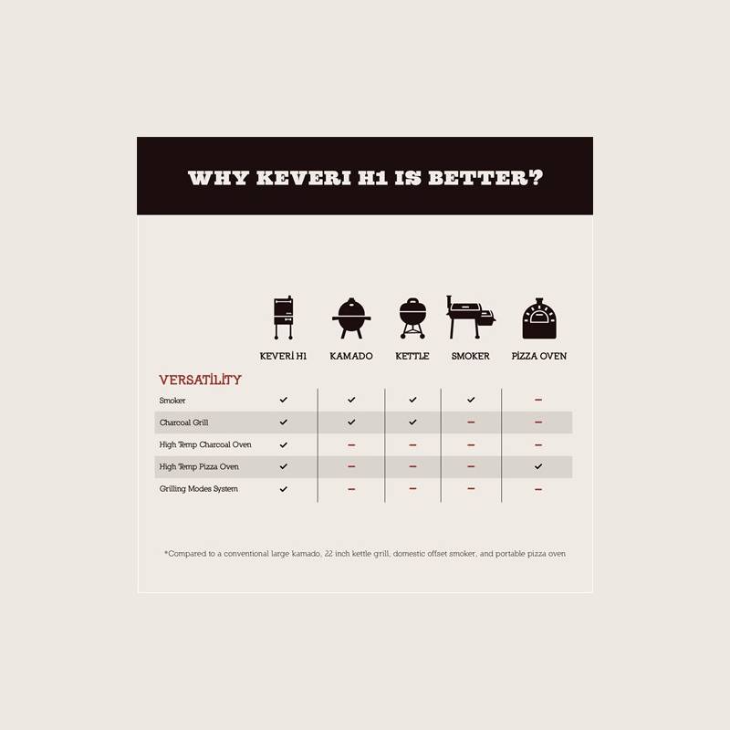 Keveri H1 is a new barbecue concept designed to change the way you grill. Achieve meat that falls right off the bone, make perfect pizzas, smoke your favorite meals, grill foods, and many more. Live the experience of having a professional grill, a clay oven, a smoker, a high temperature grilling oven, and a pizza oven all in one and perfect for your home. It includes a manual with the specific cooking times and multiple preparations so you can always surprise your guests. The Keveri H1 doubles capacity and utilizes up to 80% less charcoal than other same size grills. It is easy to use and has 4 grilling modes: Low and Slow, Classic, Fast Grill, and Pizza. Includes an owner’s manual with cooking times of multiple preparations so that you always will surprise your guests.