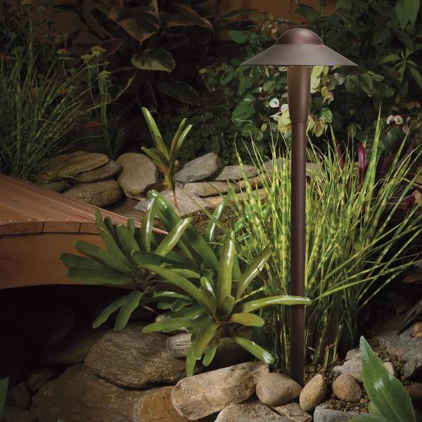 - The Kichler 15810AZT30R Design Pro LED, a wider path and spread light that is unobtrusive in the landscape