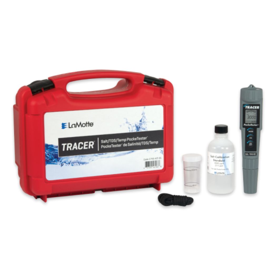 The LaMotte 1749 TRACER PockeTester offers a comprehensive solution for measuring salt content, total dissolved solids (TDS), conductivity, and temperature of water samples. This versatile tool is compact and portable, making it perfect for field use by environmental technicians and pool managers. It provides quick and accurate readings, essential for maintaining proper water balance and quality. The TRACER PockeTester is easy to operate, with intuitive controls and a clear digital display. Its waterproof construction ensures durability and reliability in various testing environments.