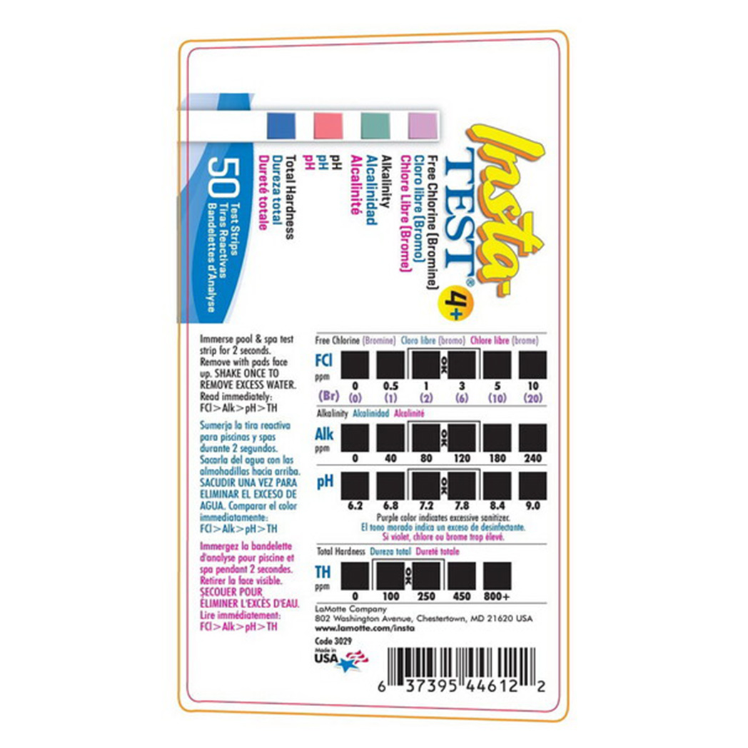The LaMotte Insta-Test 4 Plus Test Strips offer an easy and reliable solution for pool water testing. This bottle contains test strips that measure free chlorine, total chlorine, bromine, total alkalinity, and pH levels. These strips provide quick and accurate results, helping you maintain balanced and safe pool water. Made from high-quality materials, they ensure consistent and reliable readings. Ideal for both residential and commercial pools, the Insta-Test 4 Plus Test Strips make regular water testing simple and efficient.