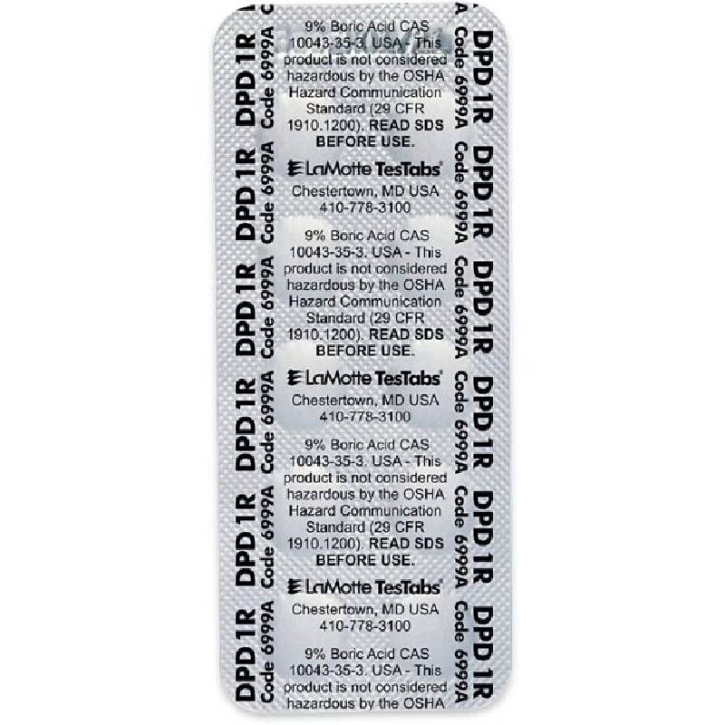 Pack of 100 The Lamotte 6999A-J Chlorine DPD #1 Rapid Tablet in a blister-style foil-packaging. Allows users to dispense a tablet into a small vial by pressing the tablet through the foil. For use with LaMotte tablet test kits. Not intended for use with ColorQ meters. The package includes 10 strips of 10 tablets per strip in a compact 3.35” x 1.35” size.