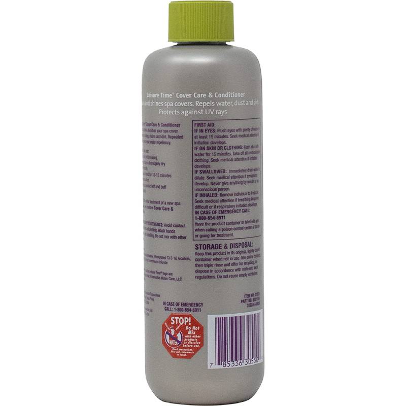 The Leisure Time Cover Care Cover Care cleans, restores and protects spa covers from weathering, fading and discoloration. Specially formulated with a UV protectant, Cover Care can be used on all vinyl surfaces, including car interiors, boats, spa covers and patio furniture. Apply twice for initial treatment of spa cover. Repeated applications increase water repellency. This spa care chemical is compatible with chlorine, bromine and biguanide products.