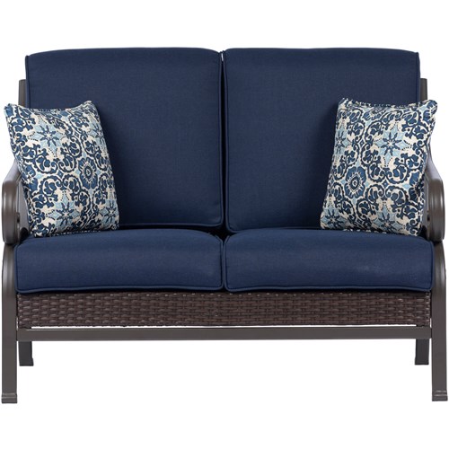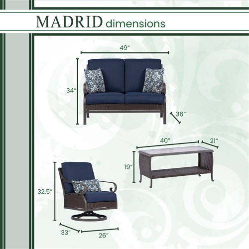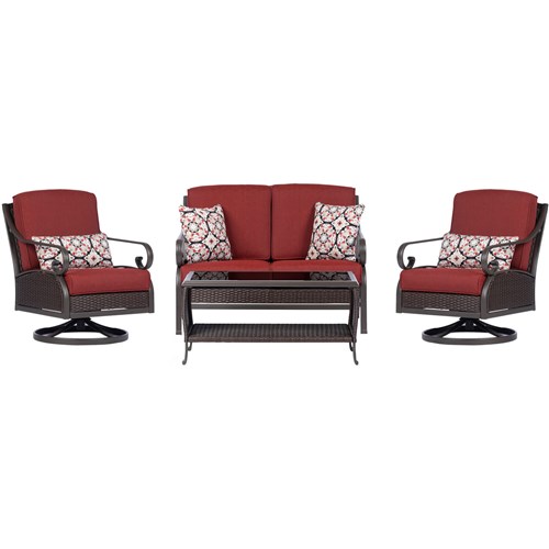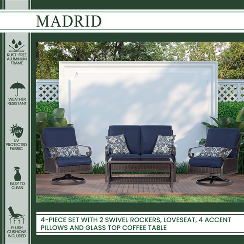 Ease into luxury comfort with the Madrid 4-piece patio chat set by Hanover. This collection includes everything you need to create an outdoor retreat in the comfort of your own backyard. One deep-seating loveseat, two swivel rocker armchairs, and a glass top coffee table are all included in this charming set. Each piece is constructed with all-weather synthetic wicker strapping and is hand-woven on top of durable aluminum frames. Each swivel glider provides a 360-degree spin and smooth gliding motion as you sit back and relax. The soft polyester fabric, used on all cushions and pillows, adds a hint of interior luxury that will greet guests with a preview of your personal style and hospitality. The thick foam cushions ensure maximum comfort while maintaining their original full shape. The coordinating coffee table rounds out the collection with matching wicker accents, handy lower shelf and brown-tinted glass insert. All materials are treated to resist weather, rust and UV fading throughout the year. Designed to last, this chat set will provide you and your guests with the ultimate conversation and relaxation area to complete your backyard oasis.