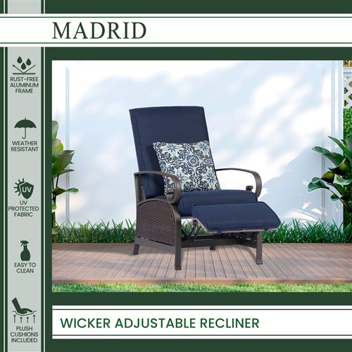 Relax in comfort and style with the Madrid Wicker Adjustable Recliner. Perfect for the patio, porch or smaller spaces, this woven chair takes comfort to a new level with its reclining mechanism and extra thick cushions. Its construction combines a sturdy, aluminum frame with an all-weather resin weave that offers many seasons of enjoyment. Multiple cushion options are available to choose from that perfectly complement the multi-tone walnut finish. An outdoor accent pillow is included to add an elegant blend of color that enhances the look of existing decor in the area. The Madrid recliner coordinates perfectly with other items in Madrid collection to give your outdoor space a cohesive, sophisticated look. Add this recliner to your outdoor collection and enjoy the most comfortable seating under the sun.