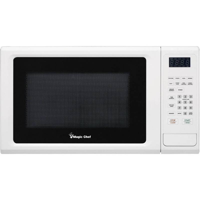 The Magic Chef MCM1110W White 1.1 CuFt. Countertop Microwave 1000 Watts Prepare a snack or a meal with the Magic Chef 1.1-cu. ft. countertop microwave oven. Quickly and easily prepare a wide variety of foods with 1000 watts of power, 10 power levels and 8 one-touch cooking programs to help you. Defrost by time or eliminate the guesswork and defrost by weight. The express cooking function and memory function streamlines your cooking time.