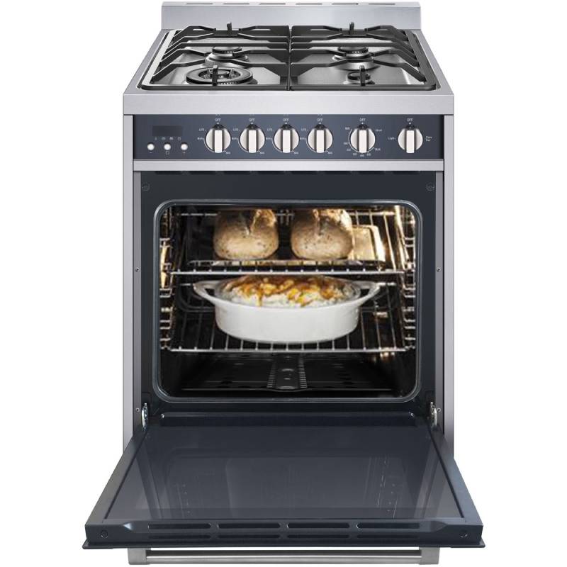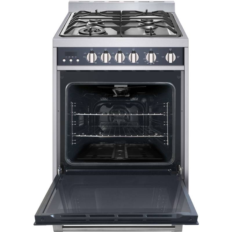 The Magic Chef 24-inch wide freestanding gas range is the perfect fit for smaller kitchens, yet lets you prepare family-size meals. The 2.7-cu. ft. capacity oven offers four cooking modes including Convection cooking. The stainless steel cooktop with cast iron grates feature four sealed brass burners with flame failure protection. Plus, the stainless steel exterior with a mirror glass finish looks stylish in any kitchen.