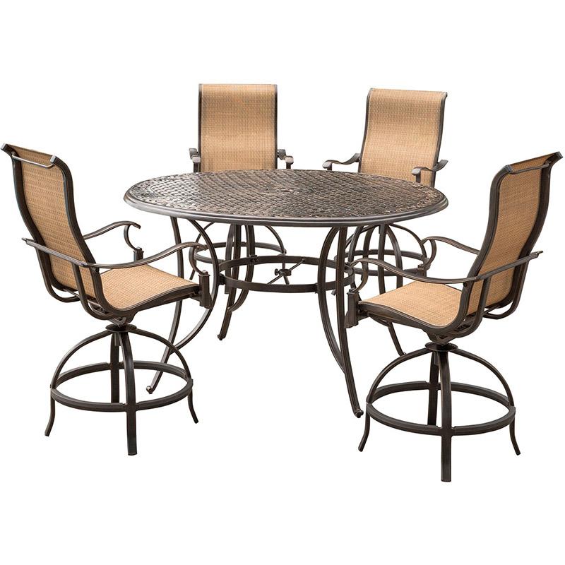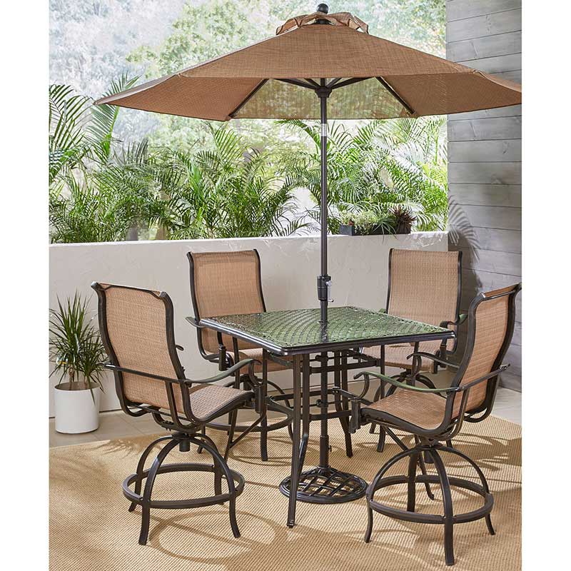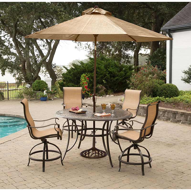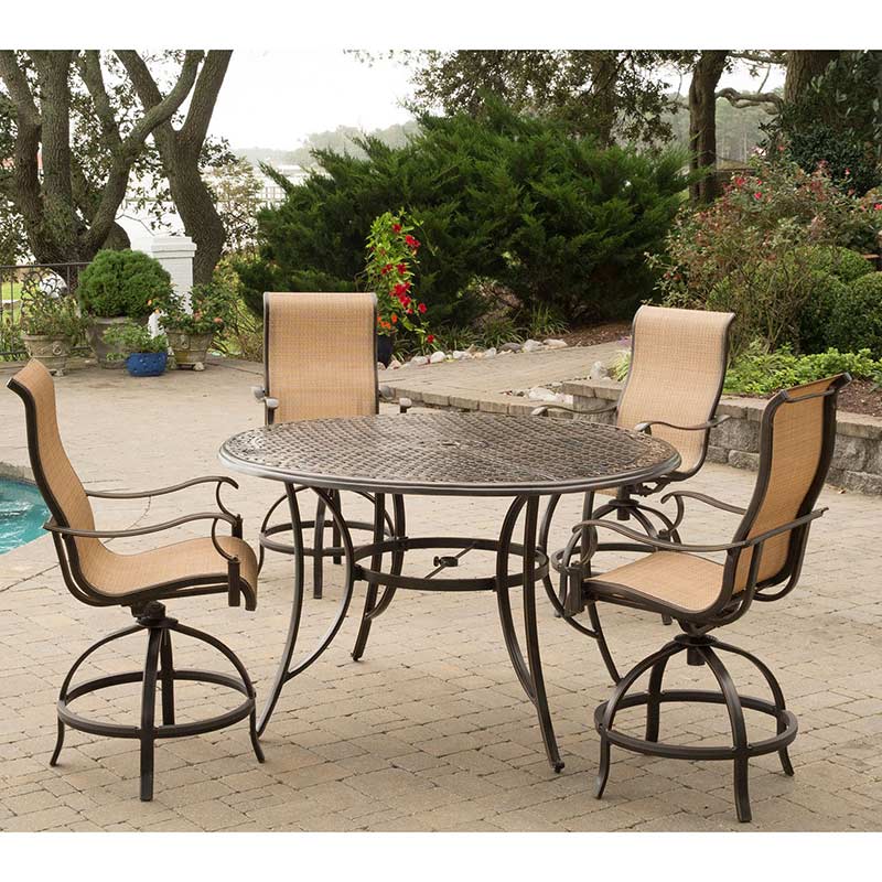 Take comfortable dining to the next level with the Manor 5-piece high-dining set from Hanover. This set includes choice of style of 4 chairs and a cast-top table and an option for a 9 ft. table umbrella and a coordinating umbrella stand. The chairs and table are constructed with heavy-duty aluminum frames and dressed with elegant cast details. Contoured sling fabric is featured on each chair providing maximum durability and comfort throughout the meal. The square cast-top dining table offers ample room for food and beverages as well as a generous amount space for entertaining guests. Built-to-last, this high-dining set will bring each meal to new heights and greet your guests with the ultimate comfort.