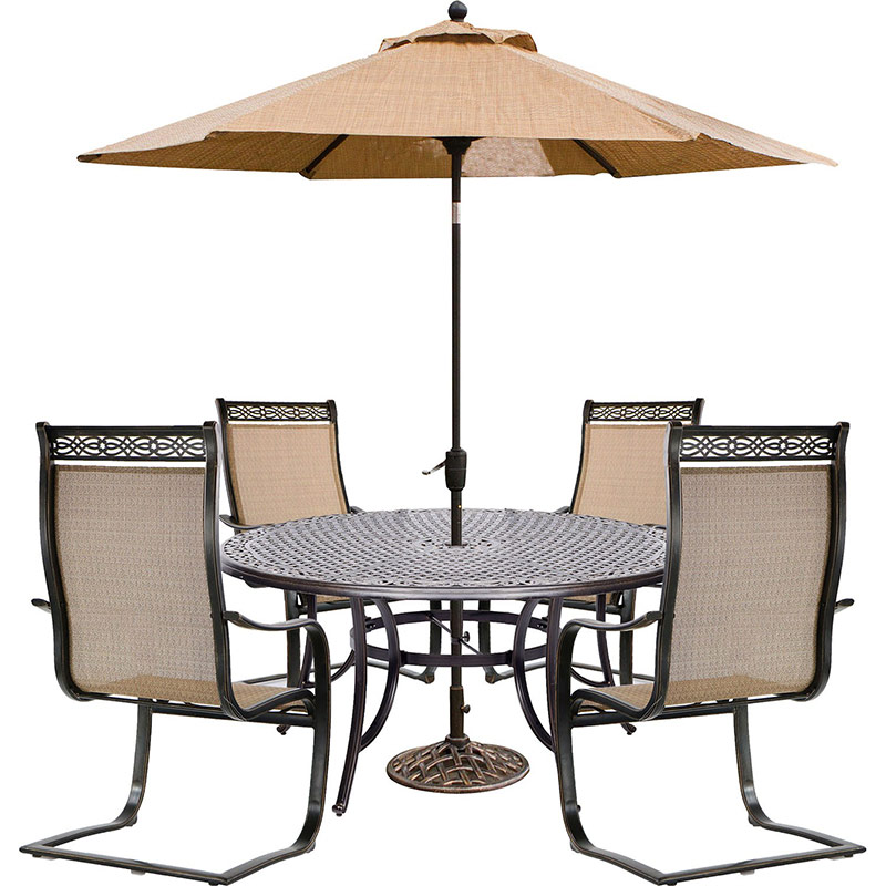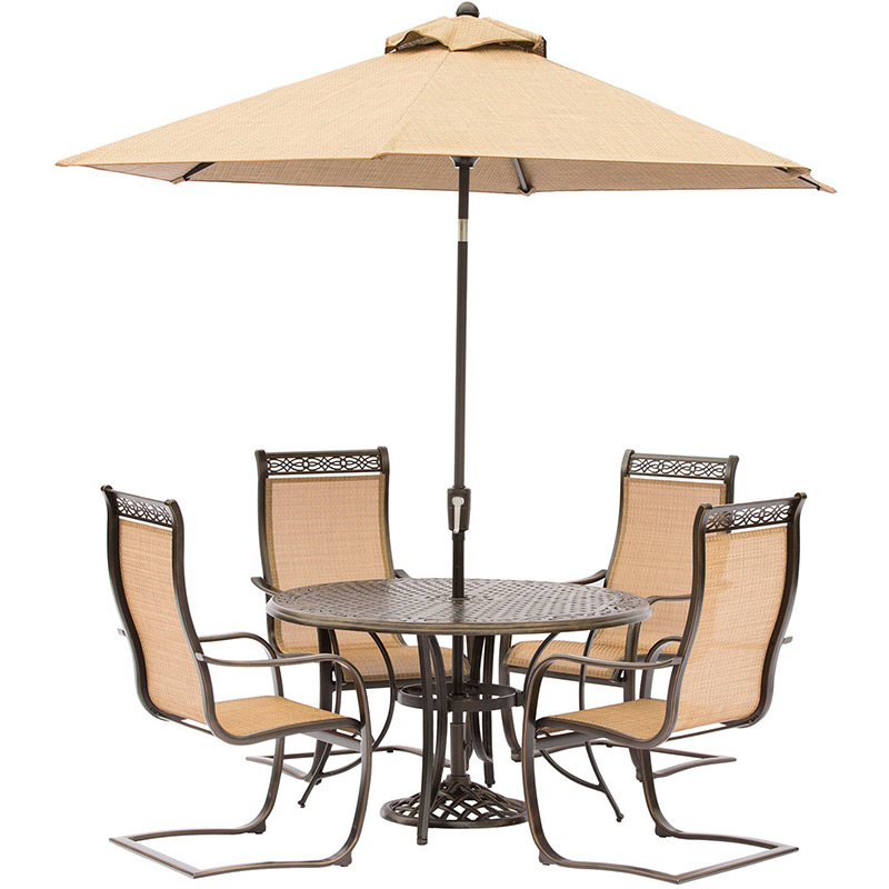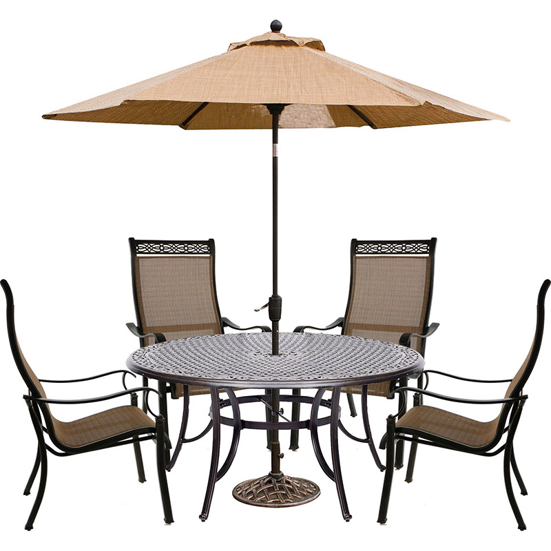 - Includes 4 chairs and a cast-top table and an option for a 9 ft. table umbrella and base