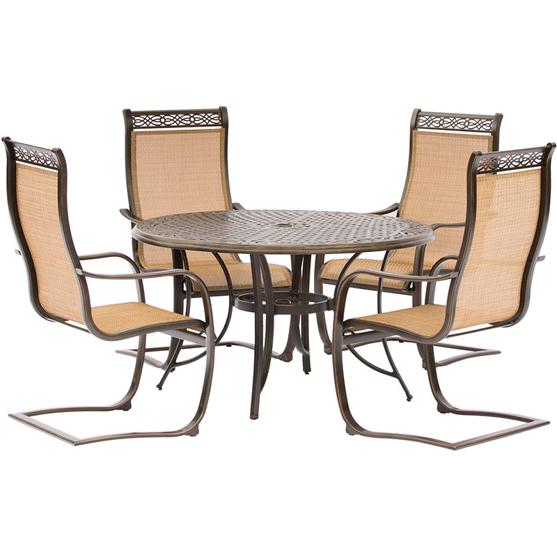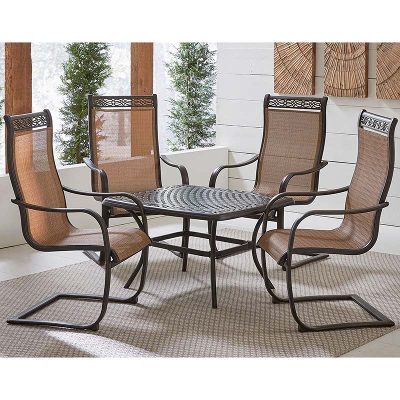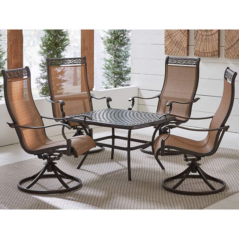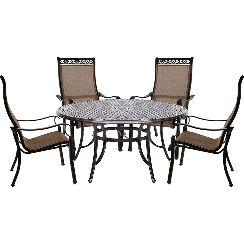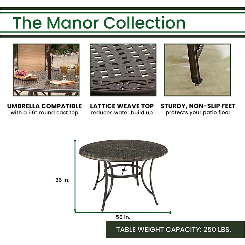 - TRADITIONAL DESIGN: The Manor Dining Collection by Hanover includes 4 stylish and elegant cast aluminum chairs and a cast-top alumiminum table. The aluminum frames are polished with a protective bronze coating that highlights the cast-accents that scroll across the top of the table and chairs. Designed to fit any backyard, patio, deck, or porch for a casual dinner or cocktails outdoors with family and friends.
