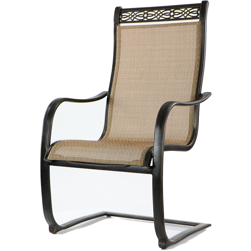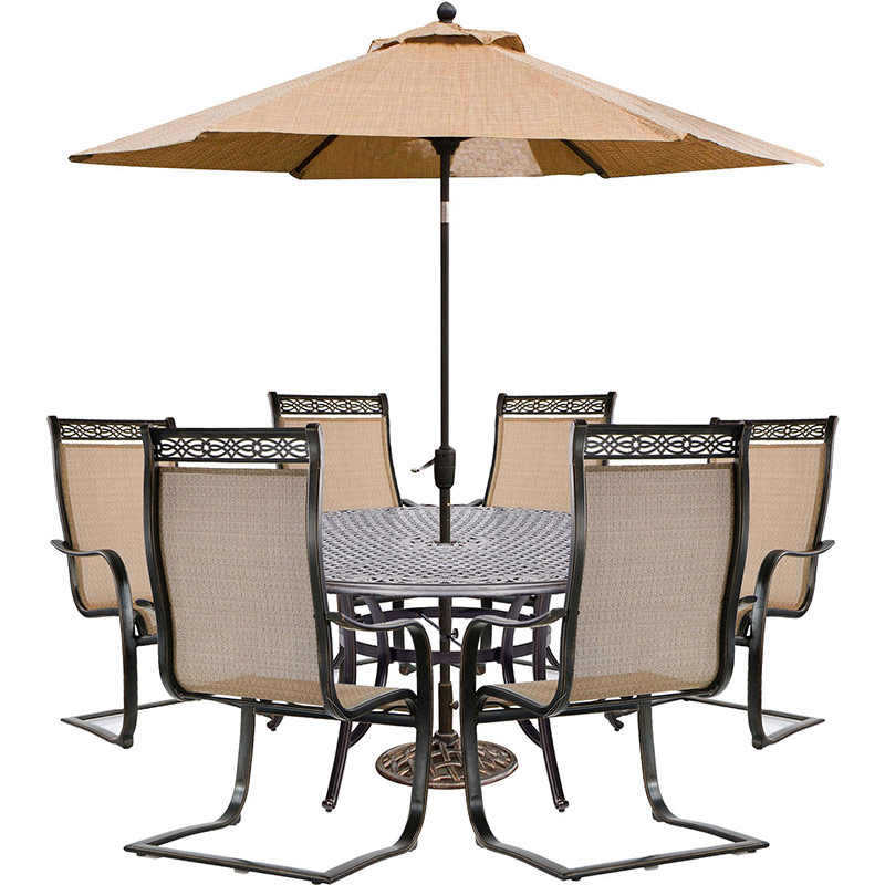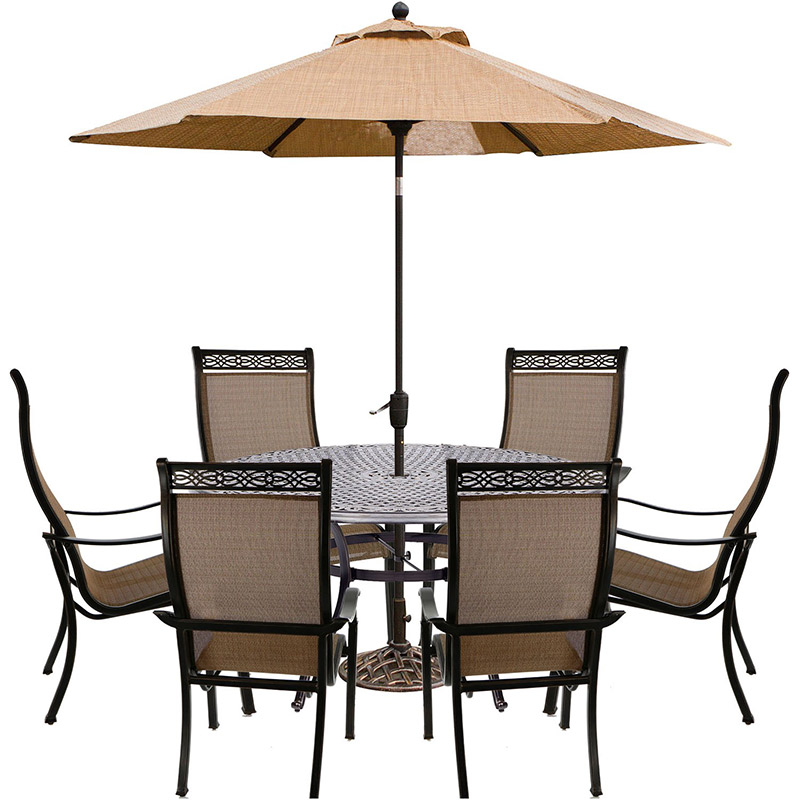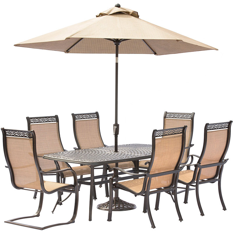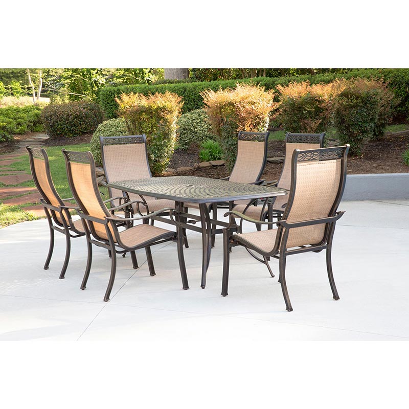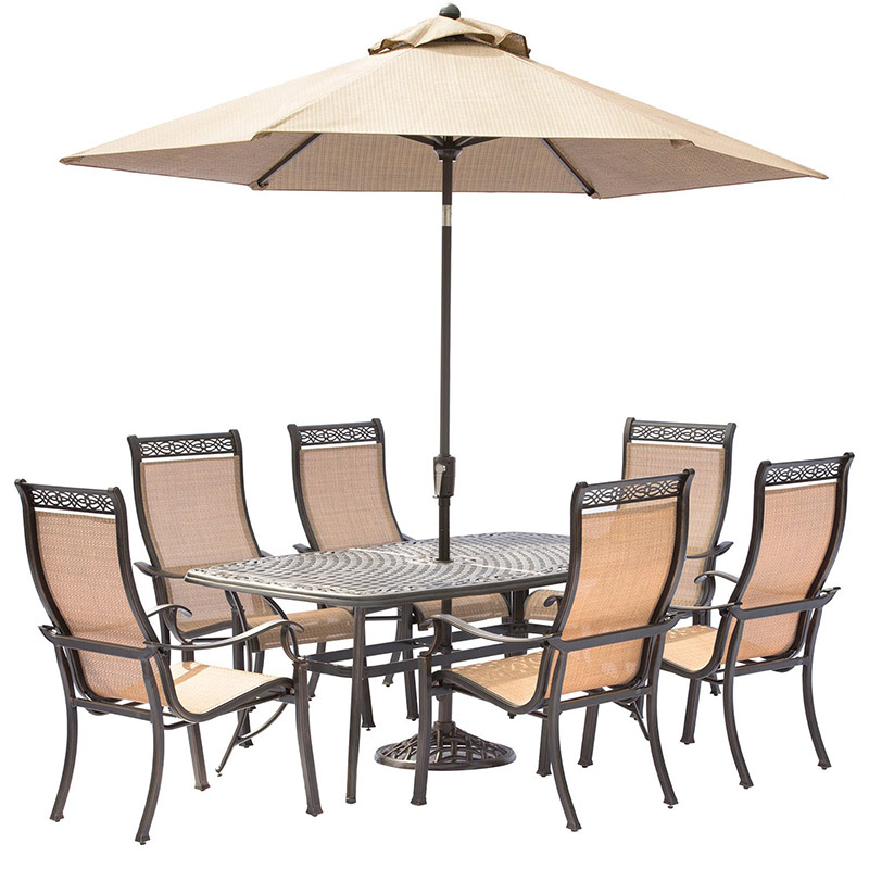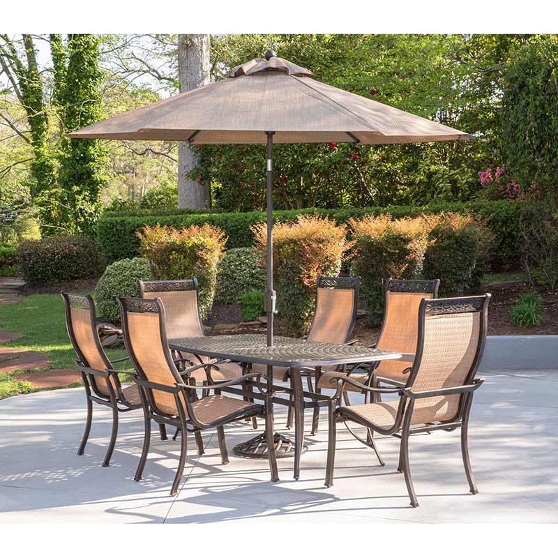 Treat your family to a new dining experience with the Manor 7-piece dining set by Hanover. This set includes one large dining table and 6 chairs, and an option for a 9 ft. table umbrella with stand. Both sophisticated and refined, this set offers the perfect accommodations while you’re entertaining your guests outdoors. The aluminum frames are polished with a protective bronze coating that highlights the cast-aluminum accents that scroll across the table and chairs. Each chair features a contoured seat using a durable PVC sling material. The neutral tones compliment any surrounding and will will quickly become the focal point to your outdoor environment. Designed for many years of enjoyment, these outdoor dining sets will provide a natural alternative to dining indoors and will greet your guests with the best accommodations under the sun.