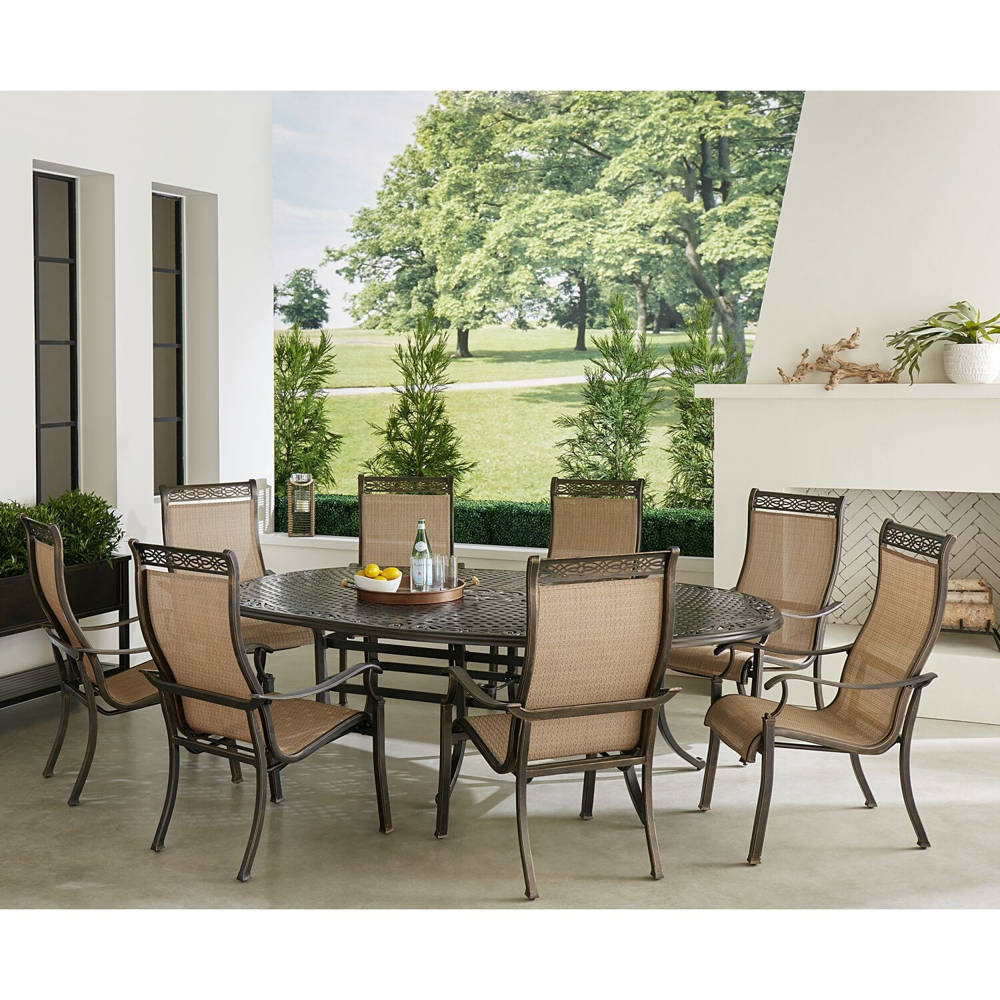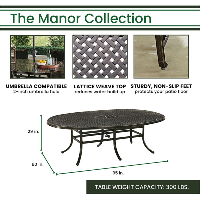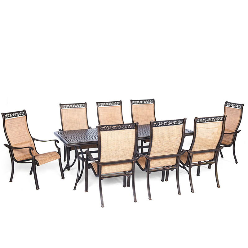 - COMFORTABLE DESIGN: The Manor 9-Piece Dining Set from Hanover Outdoor, includes a massive dining table and eight chairs with an option for umbrella with stand for the ultimate comfort throughout the meal. The set is designed with open-lattice accents and golden bronze frames. This unique dining set is the perfect addition to any backyard, or patio.