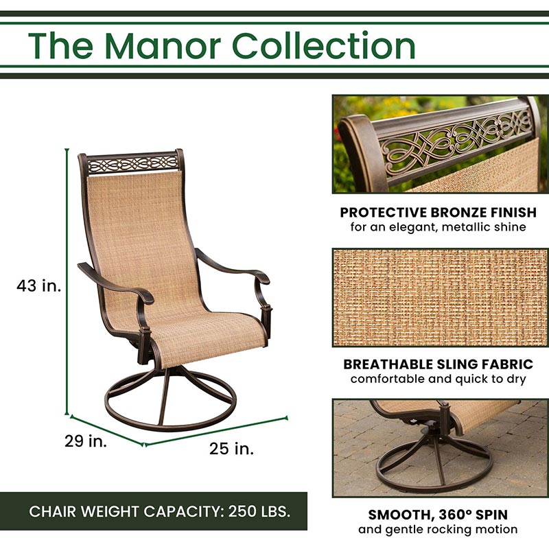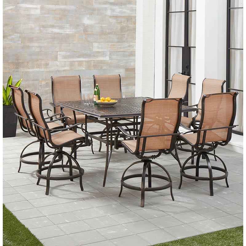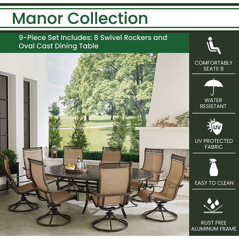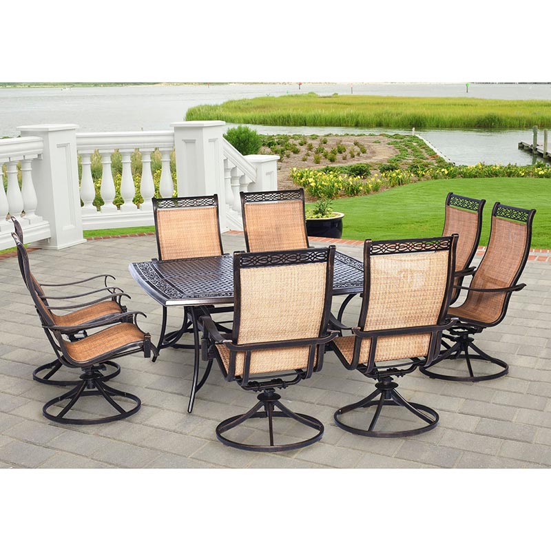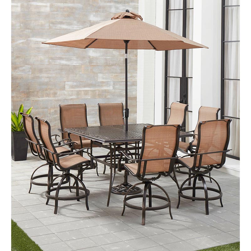 Entertain a crowd with the Manor 9-piece dining set from Hanover. This set includes choice of style of 8 chairs and choice of style of an extra-large dining table with options for a 9 ft. table umbrella with stand for the ultimate dining experience. Both sophisticated and refined, this set creates an alluring centerpiece in your backyard and adds convenience while you’re entertaining guests outdoors. Each chair features tall, contoured seats that provide upper and lower back support as you dine in comfort and style, swivel chairs that perform a 360-degree spin. Ideal for patios and decks. The extra-long table is covered with open-lattice accents that swirl across the tabletop and chairs. Durable aluminum frames are polished with a protective bronze coating that accentuates any surrounding environment and repels weathering harm. Designed for many years of enjoyment, this outdoor dining set will provide the best accommodations for those who love to entertain a crowd.