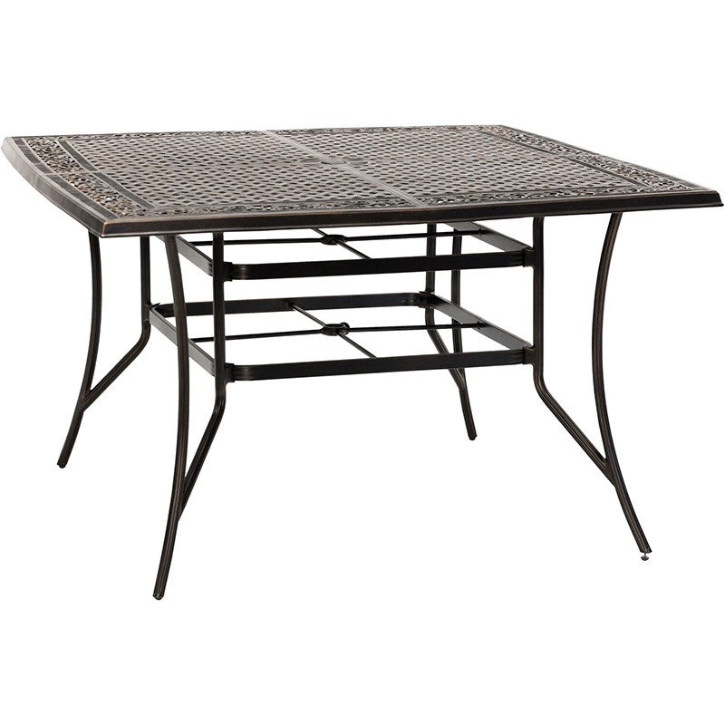 - 60-in. square tabletop with cast lattice weave and scroll design plus 2-in. umbrella hole