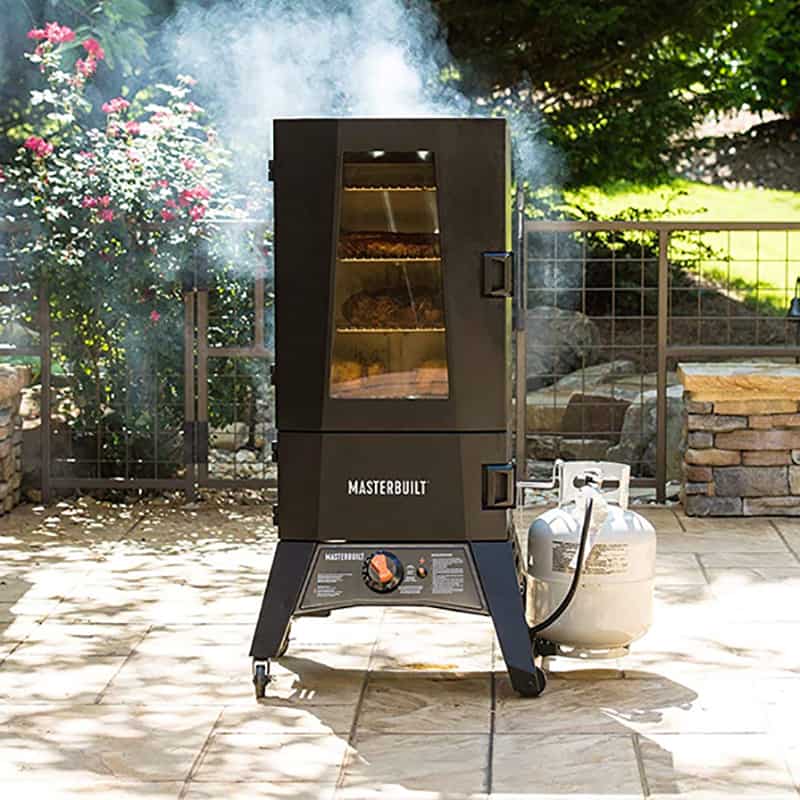 The Masterbuilt MPS 340|G ThermoTemp XL Propane Smoker, from the Adventure Series, makes propane smoking simple and safe. No more monitoring or adjusting temperature. Patent-pending innovation lets you set the temperature and walk away. The safety shut-off valve provides a safe smoking experience while the four smoking racks (plus two accessory racks) provide plenty of room to smoke your favorite foods. Smoke up to 16 chickens, 10 racks of ribs, 20 fish fillets, or 169 jerky strips. Master the art of smoking with Masterbuilt.