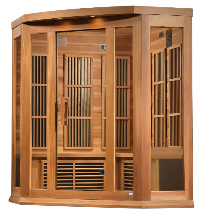 The Maxxus 3-Person Near Zero EMF FAR Infrared Corner Sauna by Golden Designs brings healthy living and longevity to the privacy of your home cost effectively. Modern technology and energy efficiency in FAR infrared carbon heating panels allow beneficial penetrating FAR infrared waves to remove body toxins, increase blood circulation, ease pain from sore muscles or aching joints, burn calories and improve skin tone among other benefits.