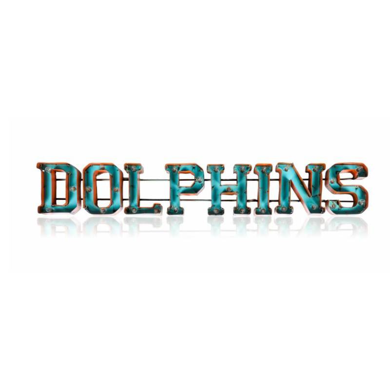 Light up your home or fancave with this Miami Dolphins Lighted Recycled Metal Sign. Suitable for indoor or outdoor use, this sign is built by hand from recycled metals and includes light strands with clear, incandescent C7 glass bulbs. An authentic style décor piece, the sign features channel lettering and exposed weld spots that give a unique, retro look to any space. This product is officially licensed by the NFL.
