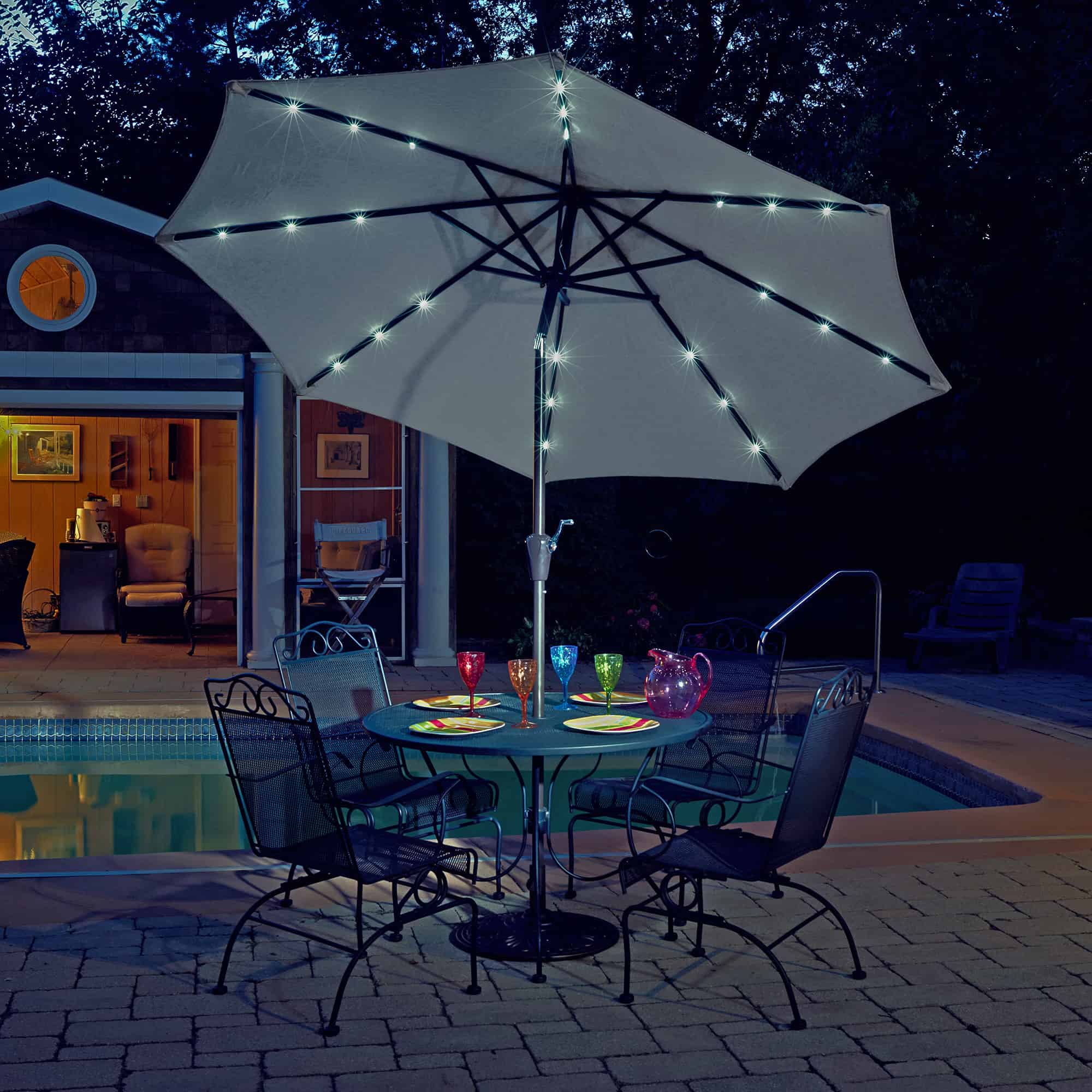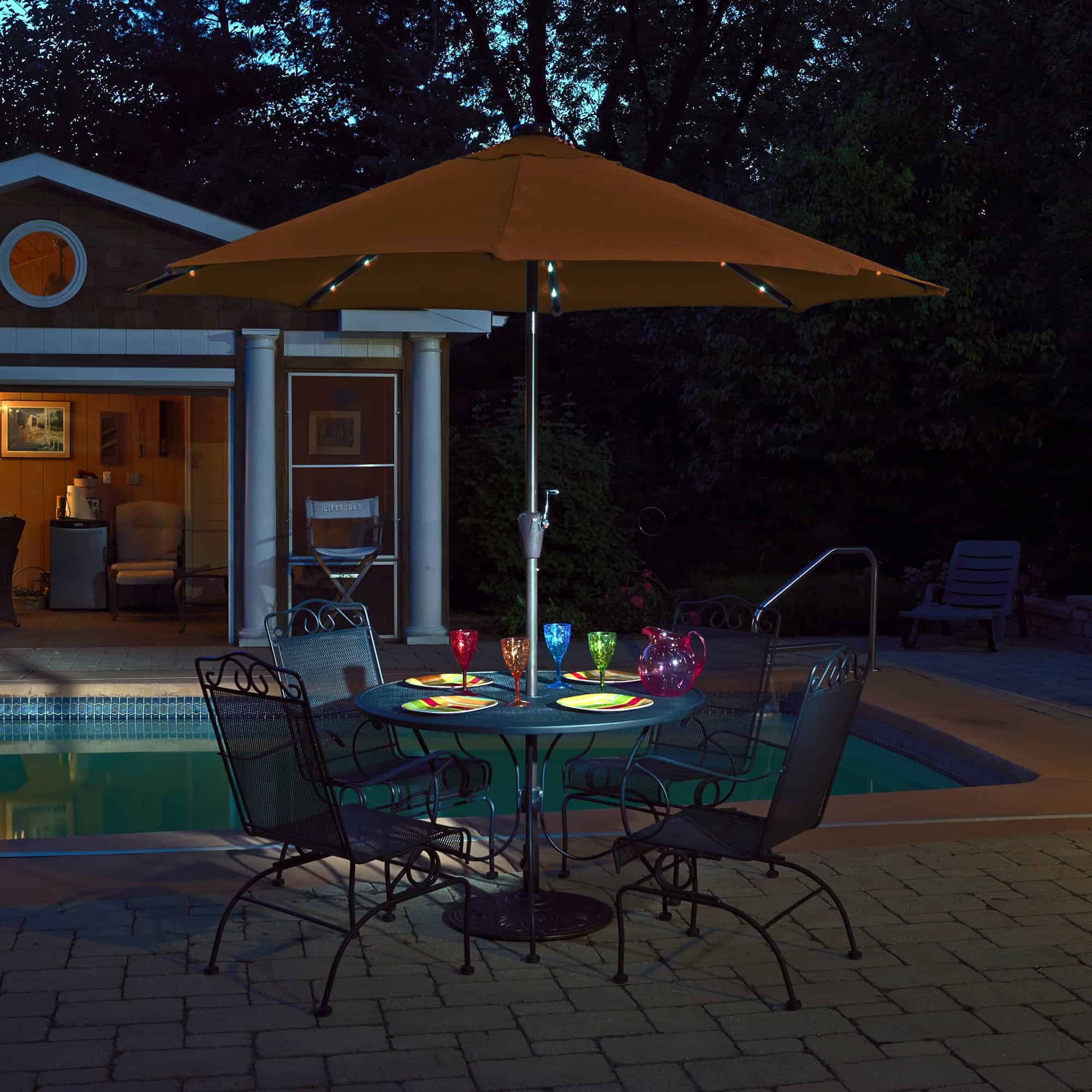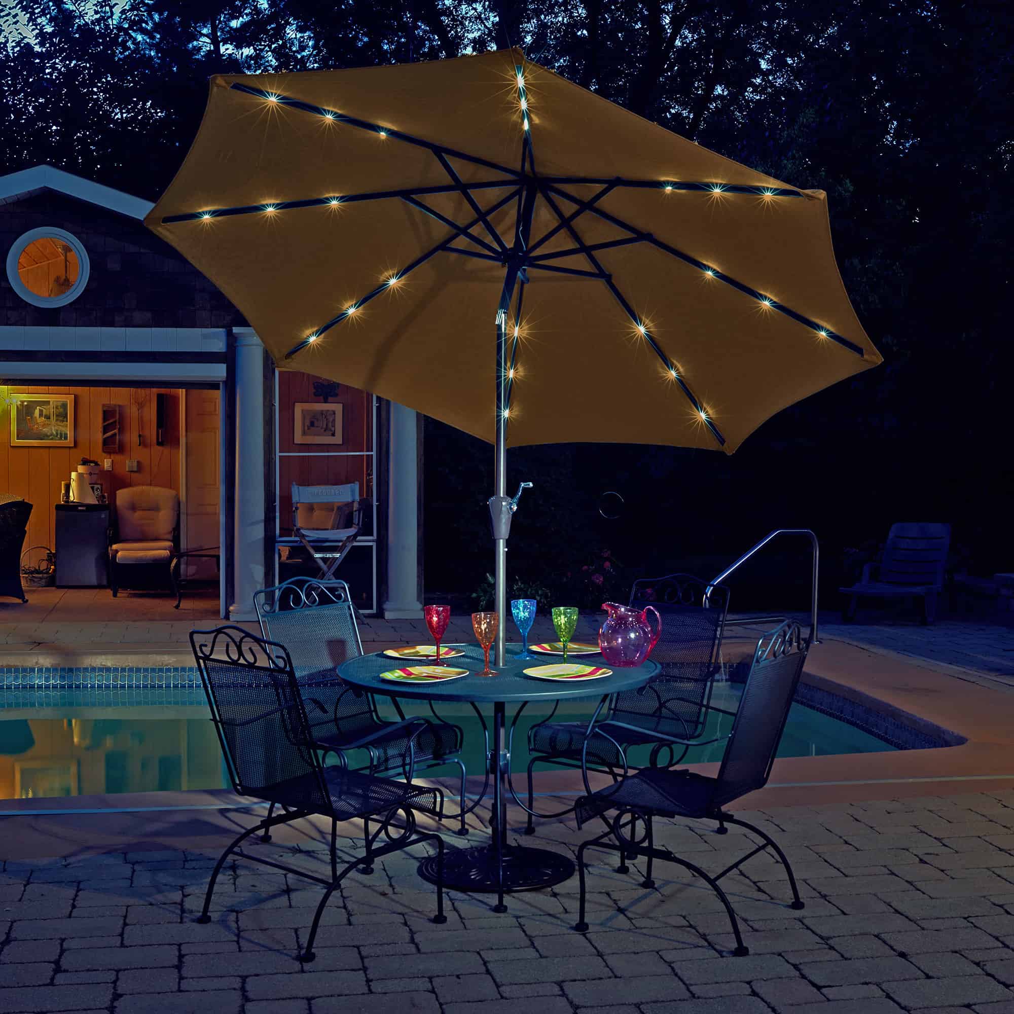 - SOLAR POWERED – Enjoy your patio day or night with the Mirage Fiesta Umbrella. Its canopy creates up to 57 square feet of shade during the day and features a solar panel that powers 24 LED lights, so you can brighten up your night when the sun goes down.