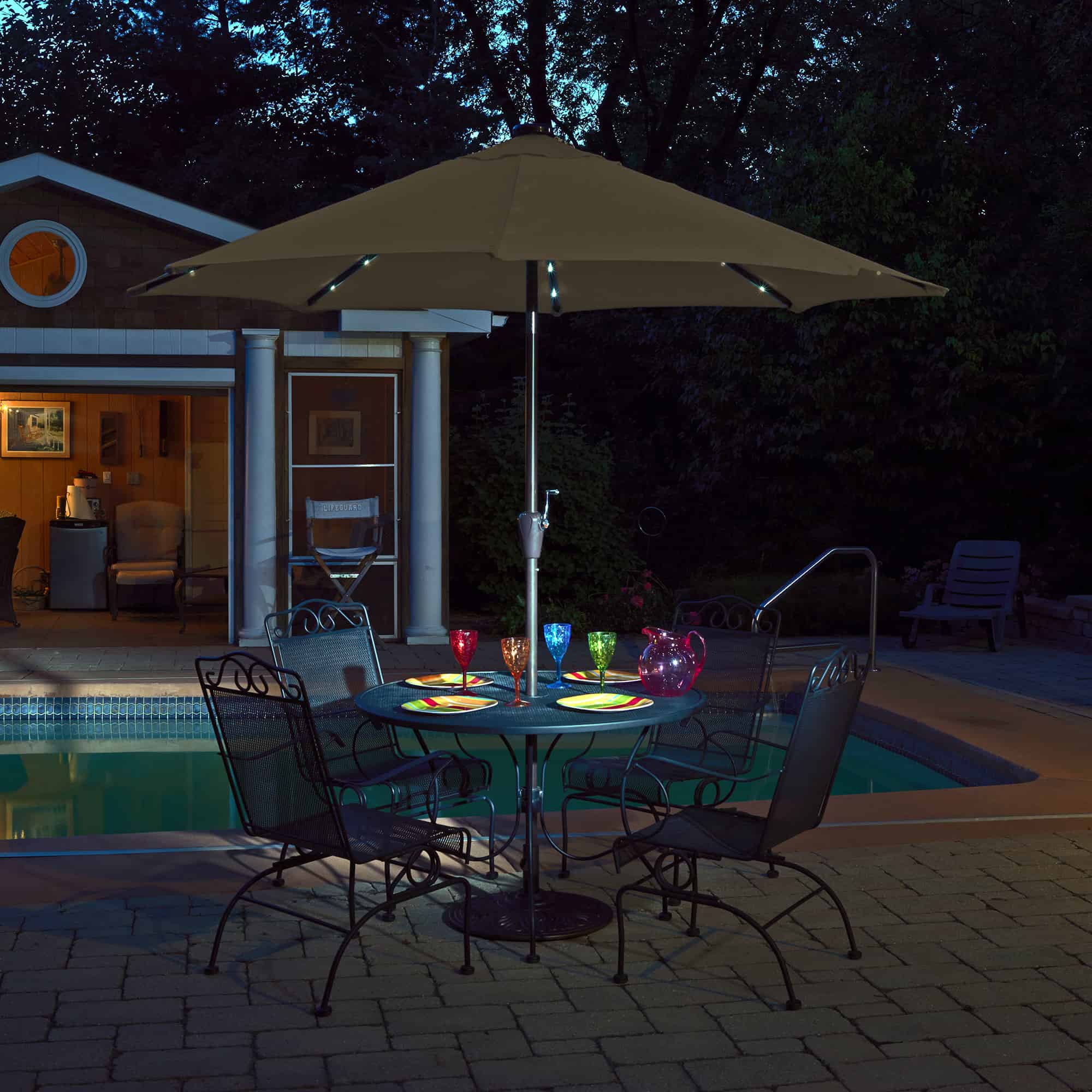 Have questions about the Mirage Fiesta 9-ft Octagonal Market Umbrella with Solar LED Lights, please give us a call! Pool Warehouse, Americas #1 source for inground pool kits, inground swimming pool liners, above ground pool liners, above ground pool kits and Hot Tub Spas since 1998.