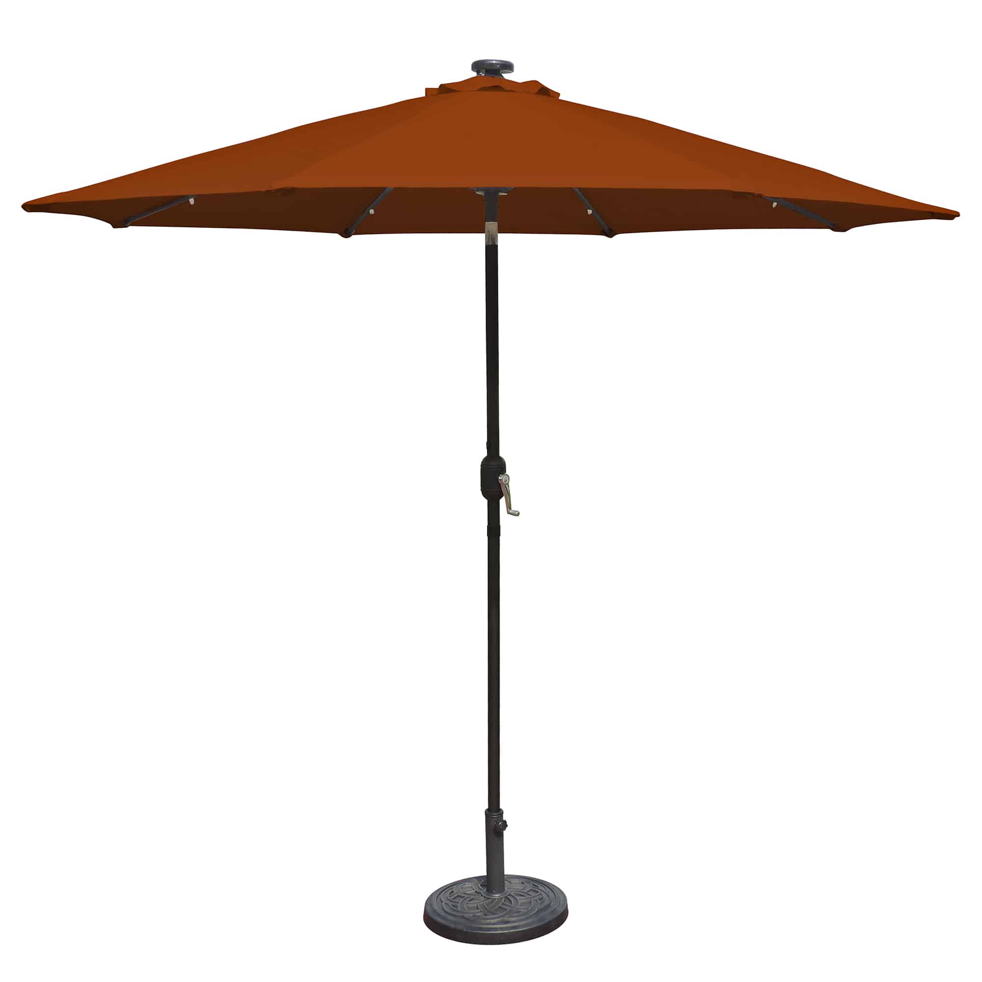 Illuminate your evening and add ambiance to your outdoor entertaining area with the Mirage Fiesta 9-ft Octagonal Market Umbrella with Solar LED Lights. Position your patio table and umbrella wherever you choose without the hassle of an inconvenient and unattractive cord. Powered by solar energy, the 24 LED lights will run for up to 5 hours when fully charged. The Mirage’s crank system seamlessly raises or tilts the canopy so you can maneuver the shade with ease. The umbrella’s sturdy 1.5-in diameter aluminum pole and 8-rib canopy support system are powder-coated in a bronze finish. The olefin canopy fabric is fade and weather-resistant, sporting a single wind vent that allows air to escape in breezy conditions. The Mirage comes with a 2-year olefin canopy warranty and a 3-year warranty on the pole and structure. A 50-lb base is recommended for this umbrella (sold separately).