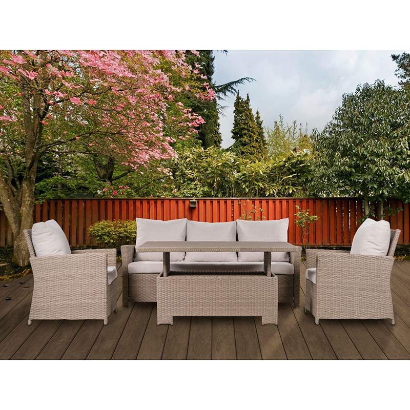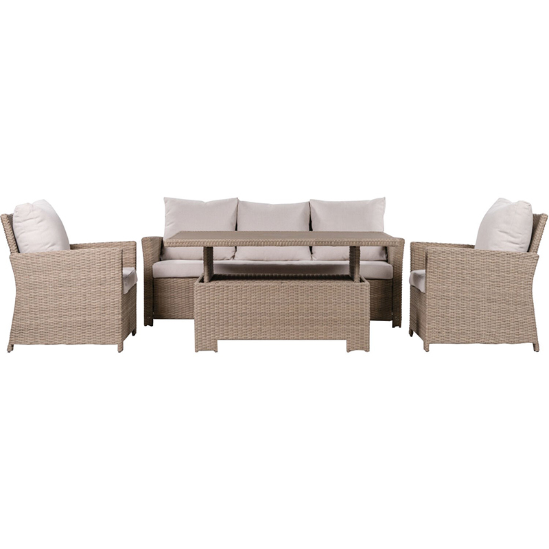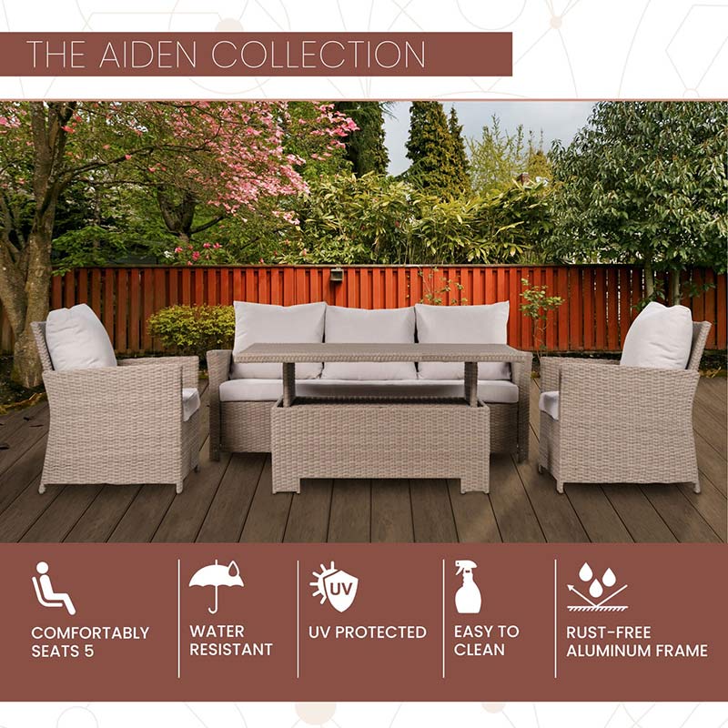 Level up your outdoor space with this Aiden 4-piece set. Perfect for any yard, balcony, porch or patio, this deep seating set can accommodate larger parties or intimate get-togethers. Friends, family and friends-that-feel-like-family can all kick back and relax bolstered by comfortable, quick drying cushions and pillows. The collection is crafted using two-tone, hand-woven PVC resin, giving you the appeal of wicker without the downsides like wear and tear and getting poked by small sticks. Rounding out the set, the adjustable coffee table is ready for all occasions—raise the table’s height to for a quick bite or casual dinner. When not acting as a dining table, lower the table and use it as a classic coffee table. Each piece of the set is made using all weather materials, built to handle whatever life throws at them and you.