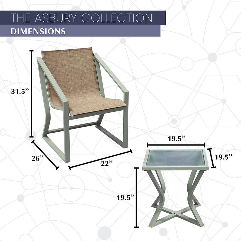 Turn every day into a staycation with the Asbury 3-piece chat set by Mod. This classic, contemporary collection includes 2 stationary chairs and matching side table. The ultra modern set is crafted from powder-coated steel, designed to resist rust and corrosion. While you get the sturdy support from the steel frame, the lightweight PVC sling fabric is contoured to the natural shape of your back for optimal comfort; it’s strong, UV-resistant, and quick to dry – perfect for poolside lounging. For maximum relaxation, rest your drinks and snacks on the matching tempered glass side table. This space-saving set is compact and convenient enough to fit in the smallest of patios, lawns or gardens but brings big-time style with its unique angular design. Made with all-weather materials, this set will be at the center of all your friendly weekday get-togethers and sun-soaked family weekends for years to come.