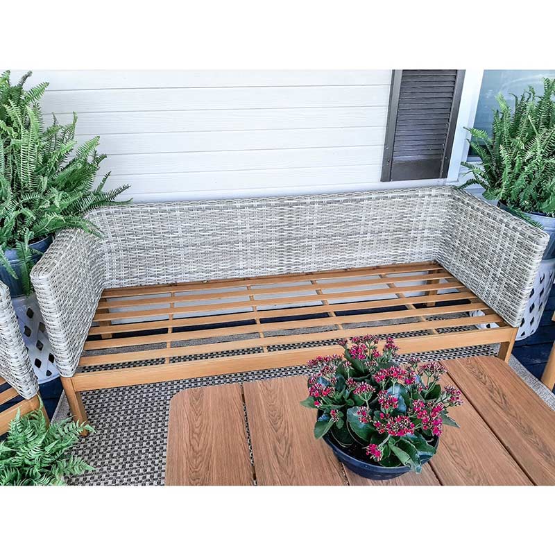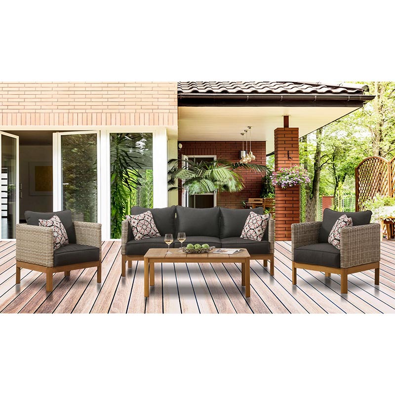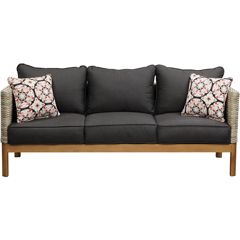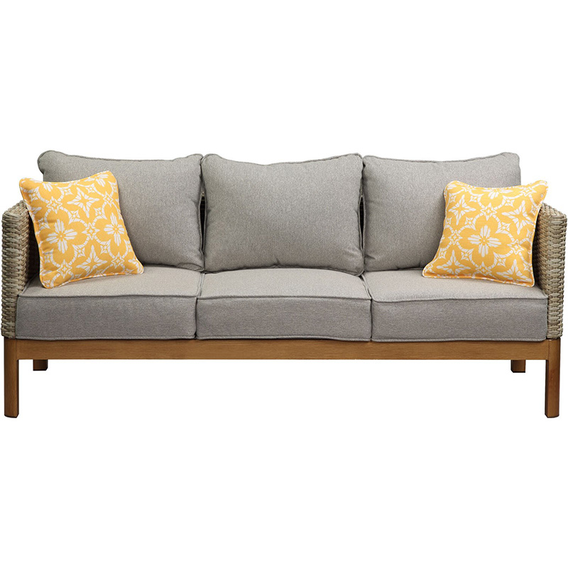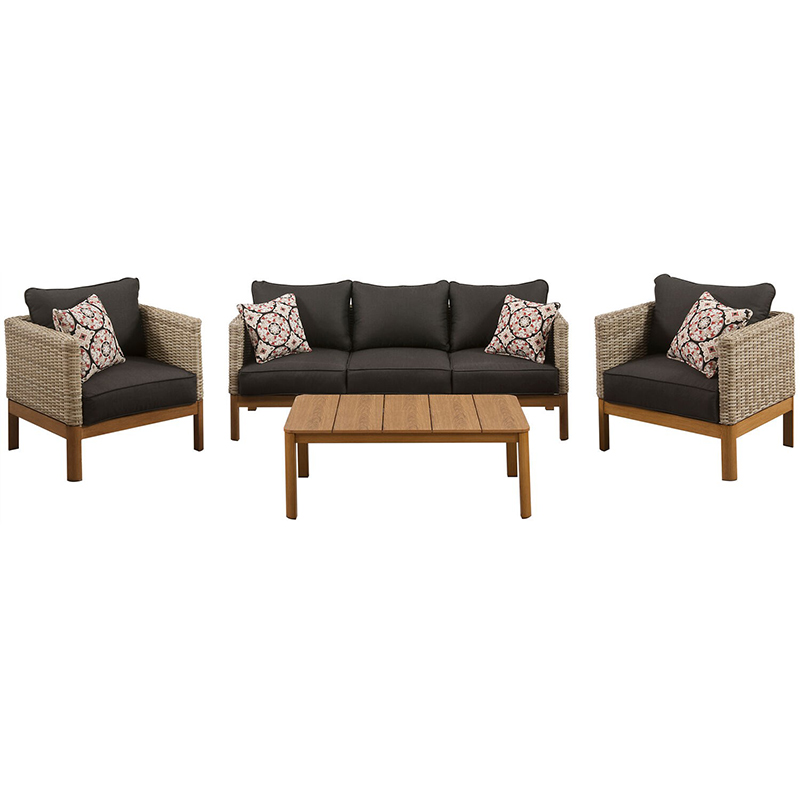 - Sofa and chairs boast mixed material design using plush cushions, hand woven frames and faux wood accents