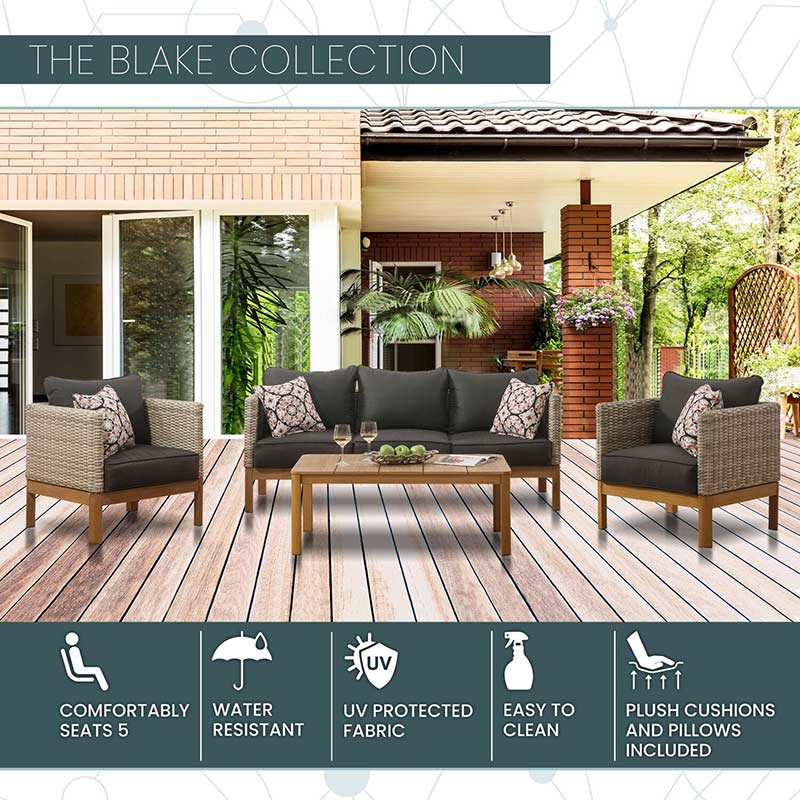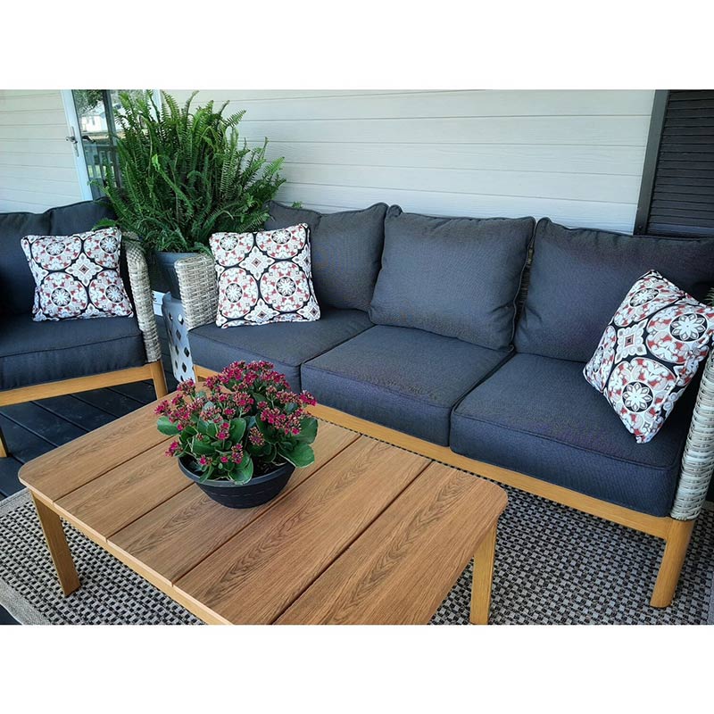 Be ready to conquer summer party season with this 4-piece conversation set from the Blake Collection. Mid-century modern meets beach vacay, it’ll bring both style and relaxation to any outdoor space. Modern design meets natural textures with the collection’s sofa and matching two bucket armchairs with your choice of grey or black cushions, all made using handwoven frames with faux wood accents covering a durable aluminum base. The stylish neutral tones of the mixed material inspired sofa and chairs are anchored by the sharp contrast of the plush black or gray cushions covered with weather-resistant outdoor fabric and accessorized with accent pillows to tie the look together. Rounding out the collection is the faux teak coffee table with polywood top. The coffee table has all of the simple yet modern charm of wood exterior, but with the added benefit of the long-lasting, rust-resistant aluminum frame, making sure it is the focal point of all your most memorable gatherings for seasons to come. Made of weather resistant materials, these pieces allow you to maximize your outdoors, even when you have minimal space.
