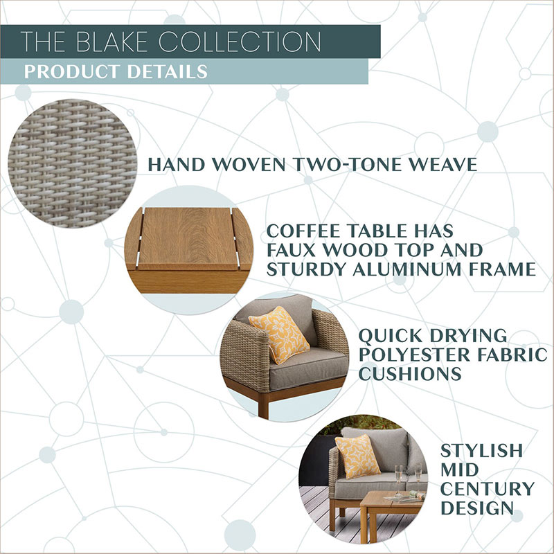 - MID-CENTURY DESIGN: The Blake Collection by Mōd Furniture is mid-century modern meets beach vacay. Modern hand-woven wicker bucket sofa and side chairs are paired with faux wood accents covering durable aluminum base and coffee table. The sofa and chairs are covered with your choice of grey or black comfy foam cushions and accessorized with fun toss pillows. Perfect set up in any backyard, patio, porch, or roof deck for a casual dinner or cocktails outdoors with family and friends.