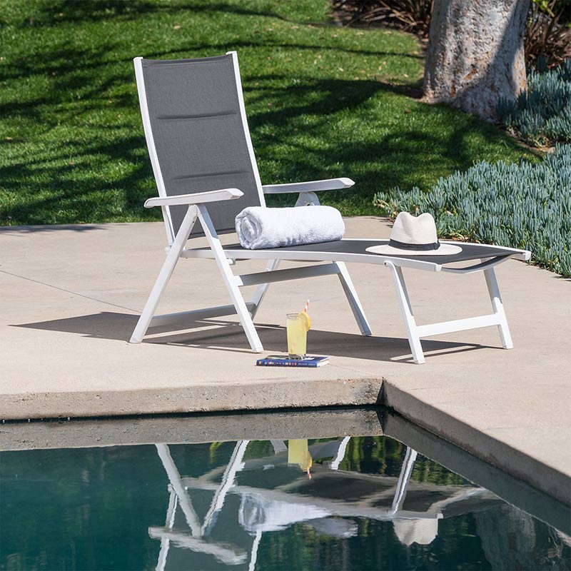 - MODERN STYLISH DESIGN: The Everson Collection by Mod Furniture is all about comfort. Take a seat in the super elegant and comfortable padded sling chaise lounge chair. The white frames and grey sling fabric really make this set unique and stand out with your guests. Perfect set up in any backyard, patio, porch, roof deck, or pool for ultimate lounge time.