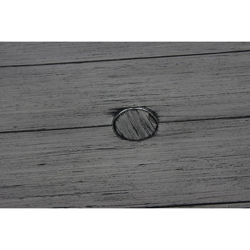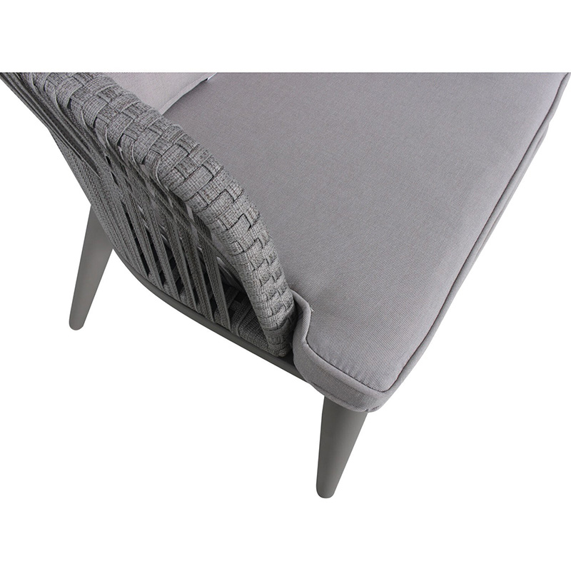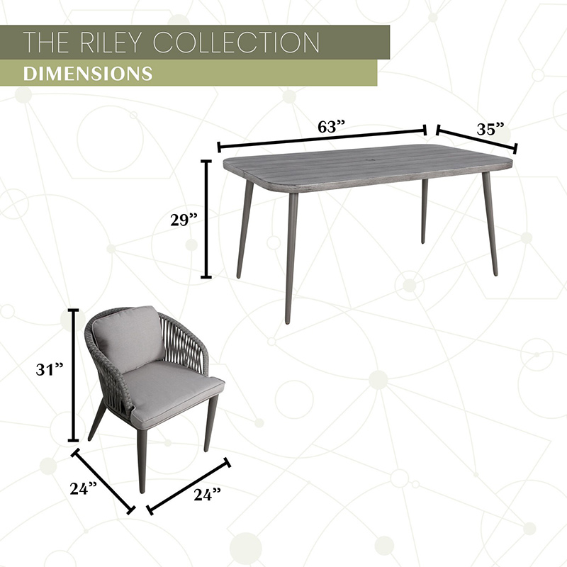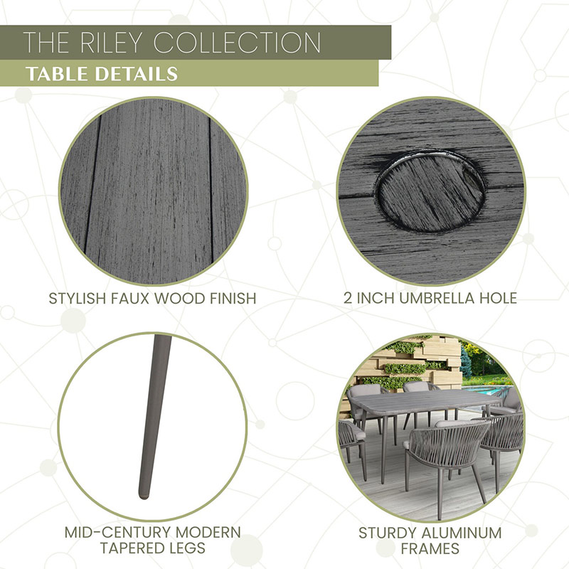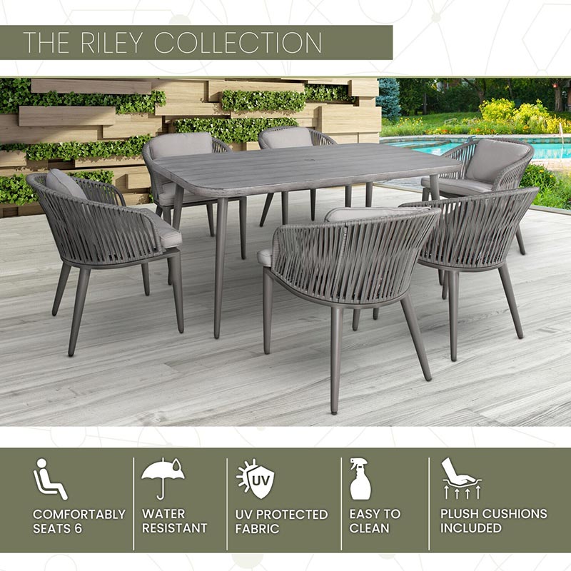 Set the scene for your next outdoor occasion with the Riley 7-piece dining set by Mod. This classic collection includes 6 dining chairs and faux-woodgrain slat top dining table. It’s decked out with everything you love about Mid-Century Modern design like tapered legs, rope accents and scoop chairs, but with contemporary benefits like sturdy aluminum frames, covered with a powder coating to extend protection against rust, scratches, and UV harm. The chairs’ wrapped rope accents are the true focal point of the set. Adding comfort to style, the chairs have thick, plush cushions and back pillows that are quick-drying and maintain their shape even if they’re left out in the rain. Made with all-weather materials, this set will be the focal point for friendly weekday get-togethers and sun-soaked family weekends for years to come.