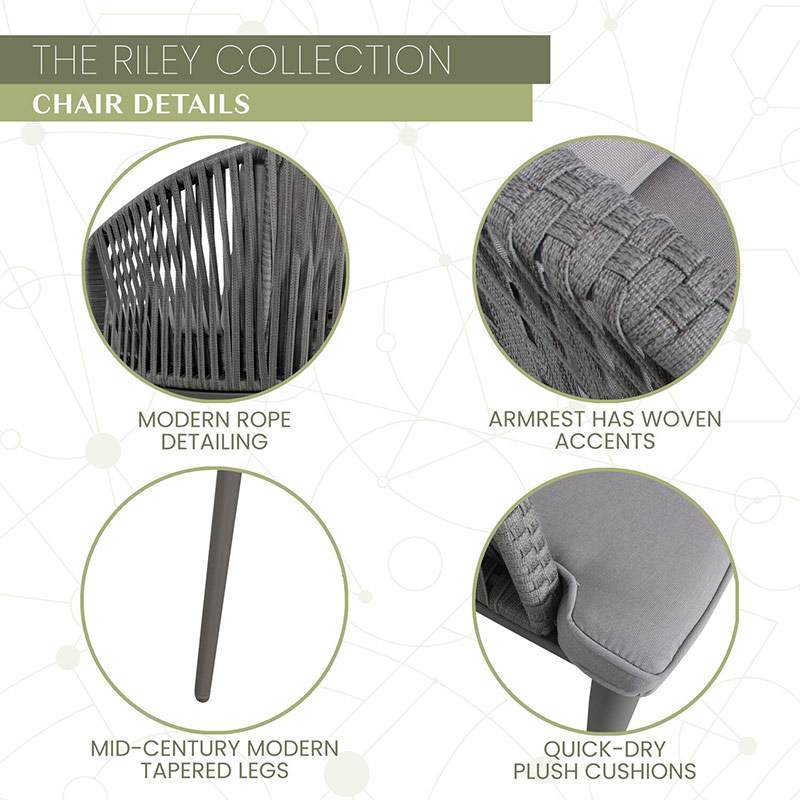 - MID CENTURY DESIGN: The Riley Collection by Mod Furniture is mid-century modern meets boho chic. Modern rope and aluminum dining chairs with faux wood top table all with tapered legs complete this stylish set. Perfect set up in any backyard, patio, porch, or roof deck for a casual dinner or cocktails outdoors with family and friends.