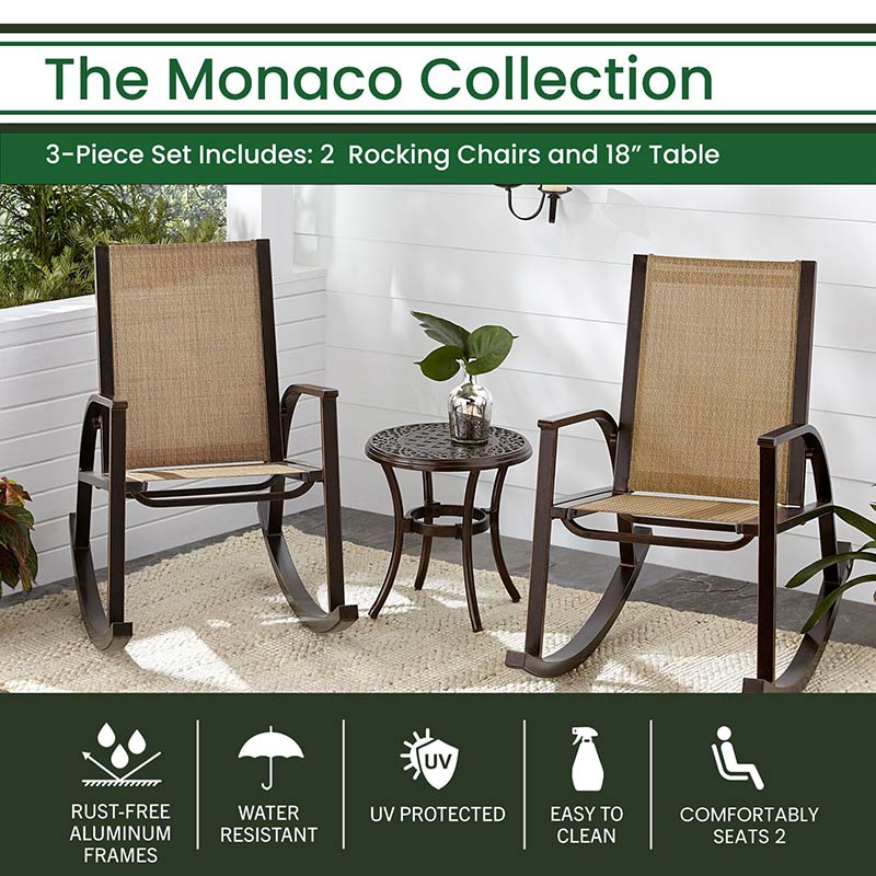 Rock into relaxation with the Monaco 3-Piece Chat Set from Hanover. This set comes with an 18-in. side table and two sling rockers. The rockers are made using durable aluminum frames coated with a protective bronze finish and comfortable and supportive sling fabric. The premium sling fabric is breathable, quick to dry and resists accidental stains and UV harm. Rounding out the set is the perfectly coordinated side table, made with the same bronze-coated aluminum and an ornate cast-top that prevents excess water build up on the table’s surface. Perfect for areas with limited space or to add seating to your existing Monaco collection, rely on Hanover to provide the most stylish outdoor furnishings under the sun.