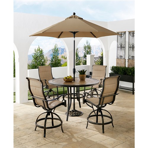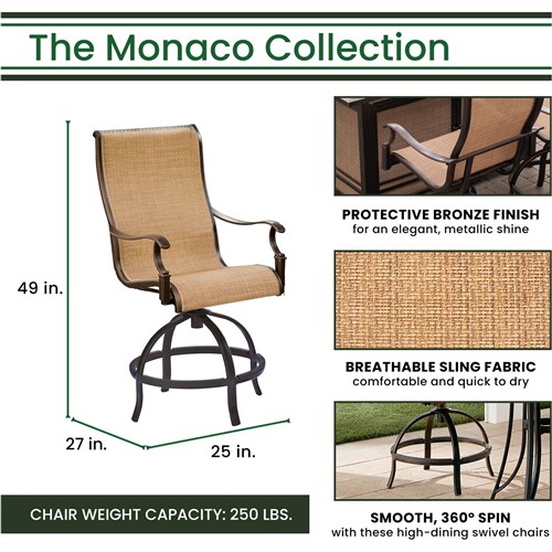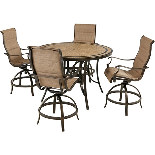 Take comfortable dining to the next level with the Monaco 5-piece high-dining set from Hanover. This set includes four sling-back chairs and a 56 in. tile-top table– each standing at a trendy counter-height. The chairs and table are constructed with heavy-duty aluminum frames and dressed with elegant cast details. Contoured sling fabric is featured on each chair providing maximum durability and comfort throughout the meal. The round cast-top dining table is covered in neutral-tone porcelain tiles and offers ample room for food and beverages as well as a generous amount space for entertaining guests. Built-to-last, this high-dining set will bring each meal to new heights and greet your guests with the ultimate comfort.
