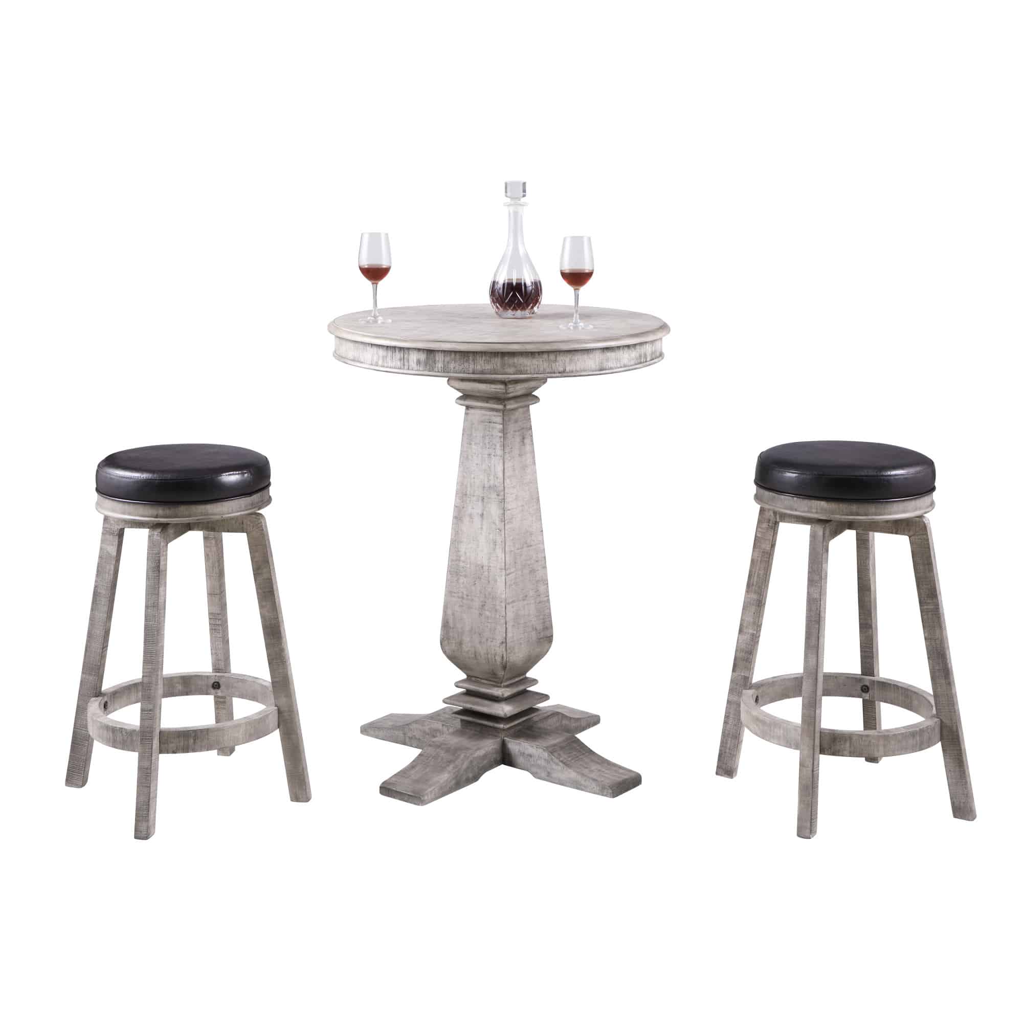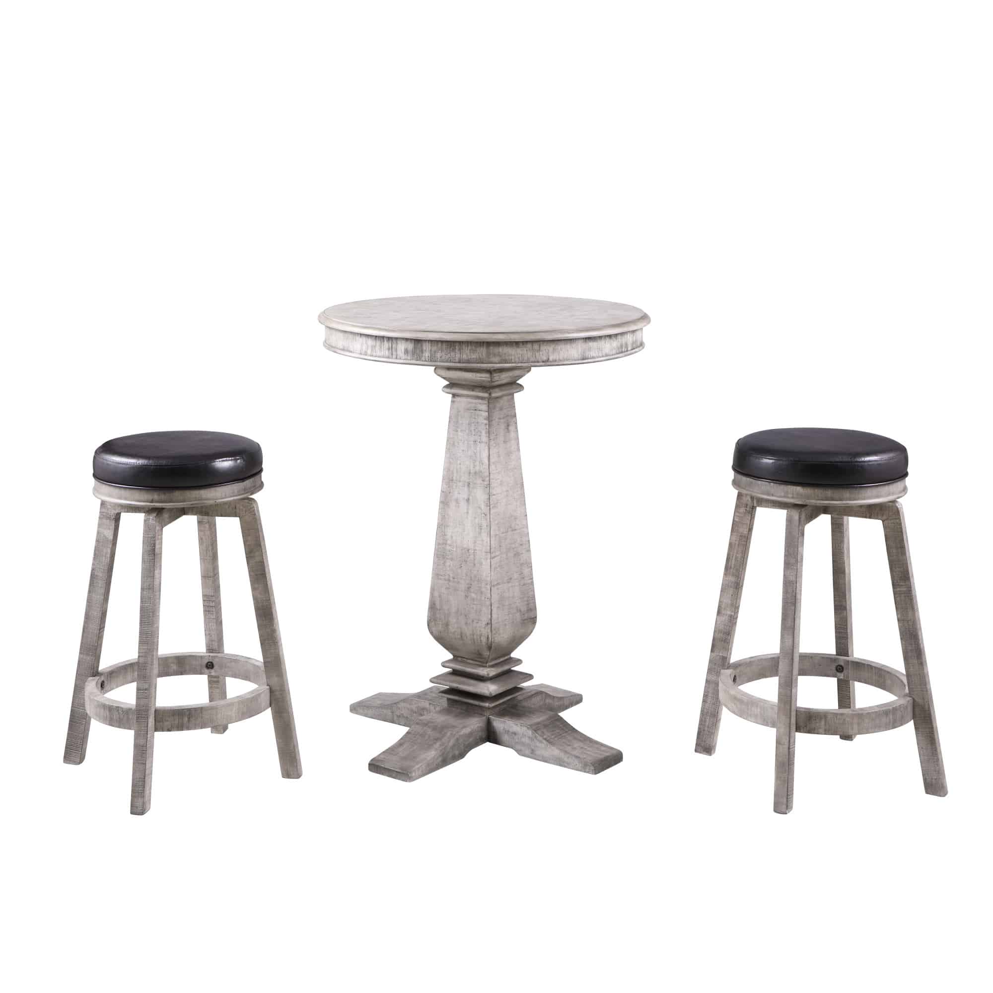 - CLASSIC CONSTRUCTION – This 3-piece set includes a round, wood veneer tabletop with sculptured legs and built-in levelers. It also includes two fabulously comfy bar stools, both with pedestal bases.