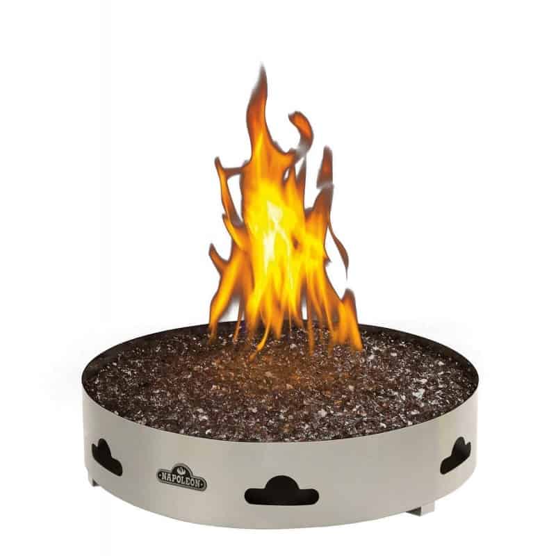 The Napoleon Patioflame with Glass from Pool Warehouse offers a whole new dimension of outdoor entertaining with the natural beauty of fire. Perfect to take the chill out of the night air or to simply bring your friends and family together, lighting the 60,000 BTU stainless steel burner sparks an atmosphere like no other. The complete stainless steel construction offers maximum outdoor durability and weather resistance while the manual gas valve offers simple and reliable ignition. The unique topaz fire glass offers a modern appearance while the propane model includes a regulator and 60-inch hose, making installation of a standard 20 lb. propane tank easy.