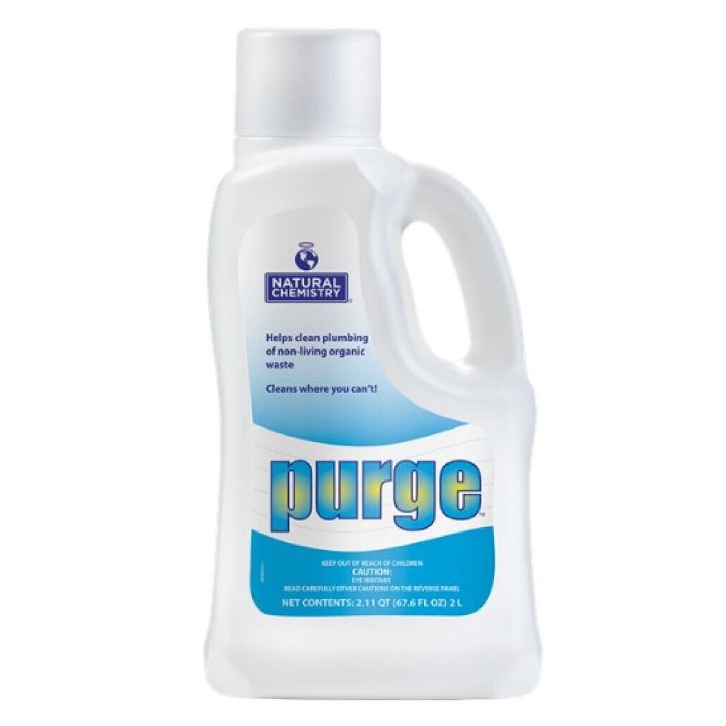 The Natural Chemistry 2 Liter Purge Pipe Cleaner prevents Purge attacks the root cause of most pool maintenance problems, the build-up of non-living organic waste contamination! Non-living organic contaminants like oils, lotions, sunscreen, cosmetics, hair products, and sweat are the underlying root cause of many pool issues. High non-living organic loads will cause cloudy water, hard-to-maintain chemical levels, clogged filters, foaming and nasty waterline rings.