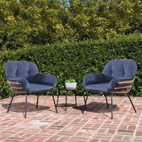 - BOHO DESIGN: The Naya Collection by Hanover includes a 3 piece furniture set. This space-saving set includes two open weave accent chairs, complete with 4-sided cushions and a 22″ round side table. Designed with contemporary black frames and chic navy fabric, this set is perfect for modernizing and adding flair any backyard, or patio.