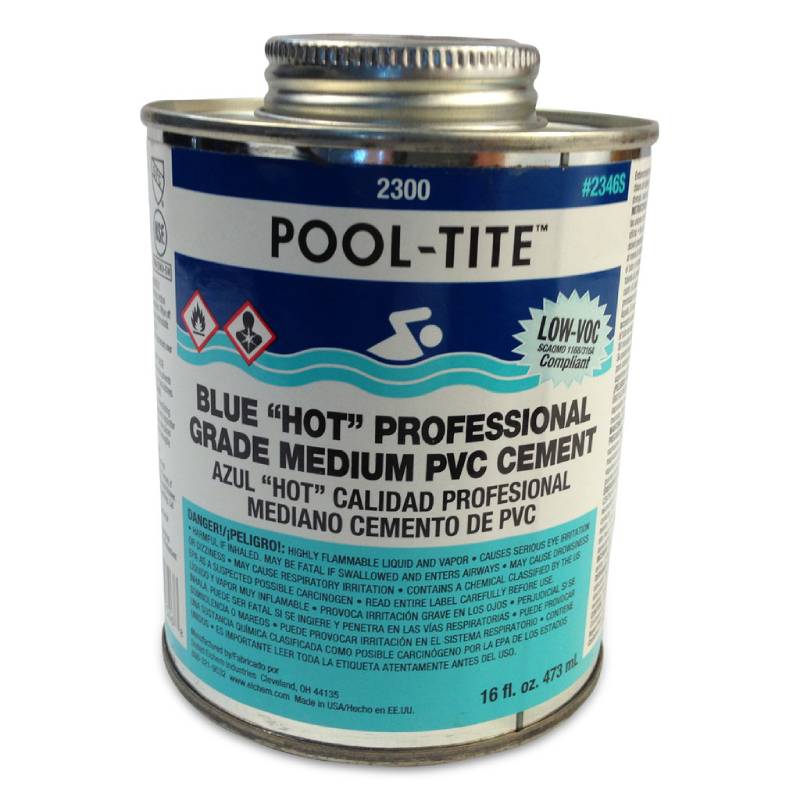 The Oatey PVC 2346S Pool-Tite™ Medium Bodied Very Fast Set “Hot” Blue Cement is recommended for potable water, pressure pipe and DWV applications. It is formulated for wet conditions or situations involving fast installation or pressurization of flexible and rigid PVC pipe and fittings. Oatey products have earned the trust of plumbing professionals for over 100 years.