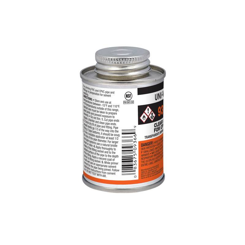 The Oatey Uni-Weld 9366S Series Clear Primer is formulated for PVC and CPVC pipe and fittings. Aggressive primer removes surface dirt, grease and grime as well as softens the pipe surface to allow a fast, secure solvent weld. Oatey products have earned the trust of plumbing professionals for over 100 years.