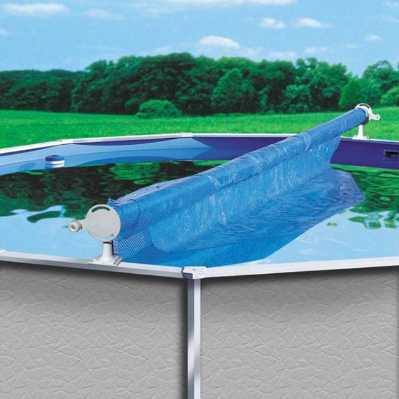 Mounts on top of rail of pool. Lift and swing feature for easy one person removal. Needle bearing race and ultra glide systems. Hand wheel on both sides. Telescoping aluminum tubing for exact fit. M818 fits pools 18 ft. round or oval. M824 fits pools 24 ft. round or oval. M828 fits pools 28 ft. round or oval. Extension kit for 32 ft. and 34 ft. pools.