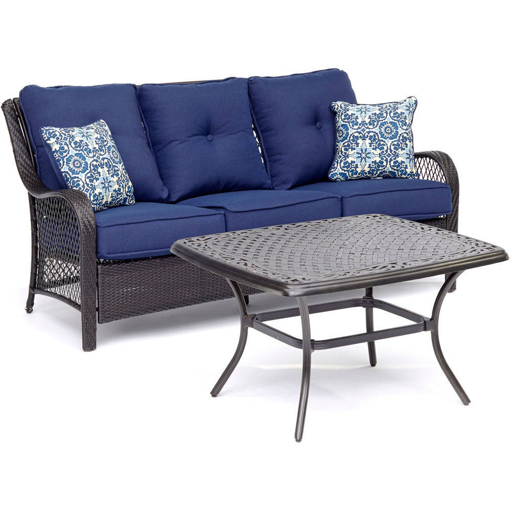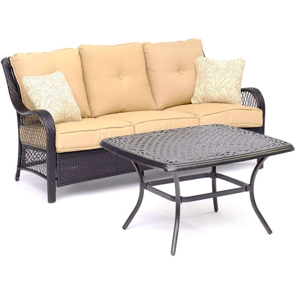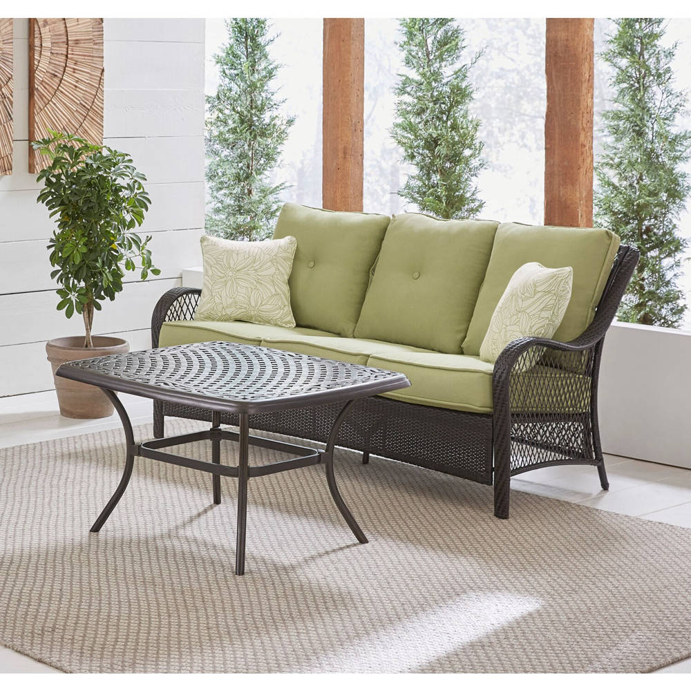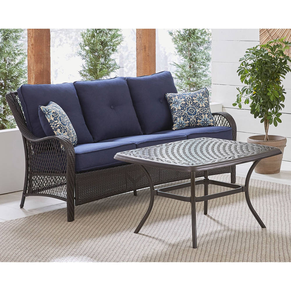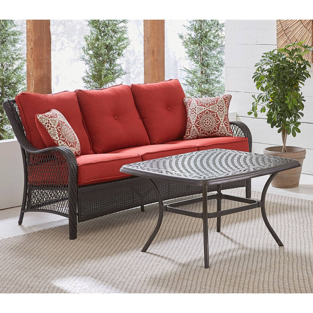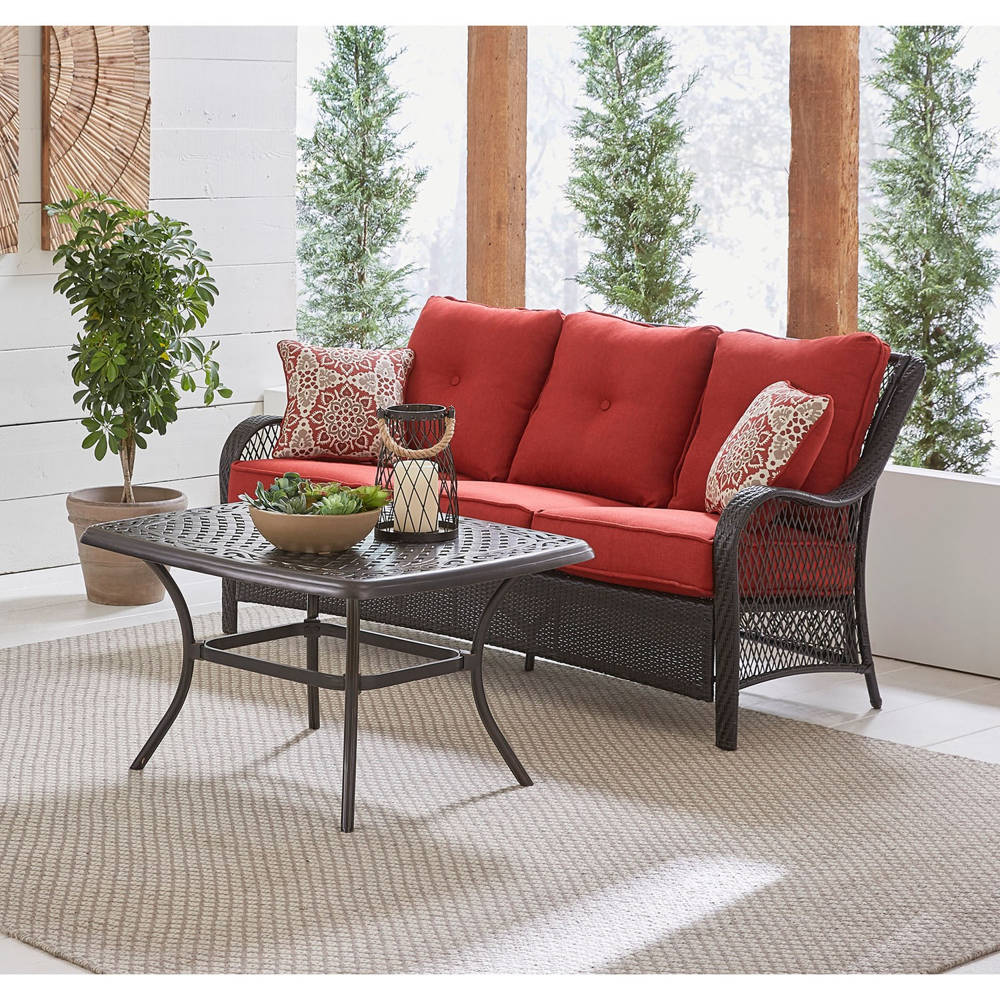 Relax in casual style and comfort with the Orleans 2-Piece Patio Set from Hanover Outdoor. This trendy set includes one all-weather, deep-seating sofa, two coordinating toss pillows and a glass-top coffee table perfect for smaller areas like porches, gardens or patios. Spacious enough to comfortably seat three adults, this outdoor set consists of heavy-duty, rust-resistant steel frames beneath an all-weather resin weave. This sophisticated construction is treated to withstand the toughest weather conditions and lasts much longer than traditional wicker. The coffee table features a tempered-glass top and includes a lower shelf for additional storage. The plush back and seat cushions are made with extra-thick layers of foam that will cradle you and your guests in complete comfort. The entire set requires little maintenance, is easy to assemble and designed for many years of outdoor enjoyment.