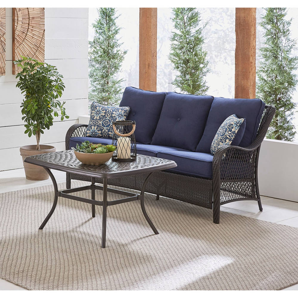 - Set includes one deep-seating sofa and one glass-top or cast-top coffee table