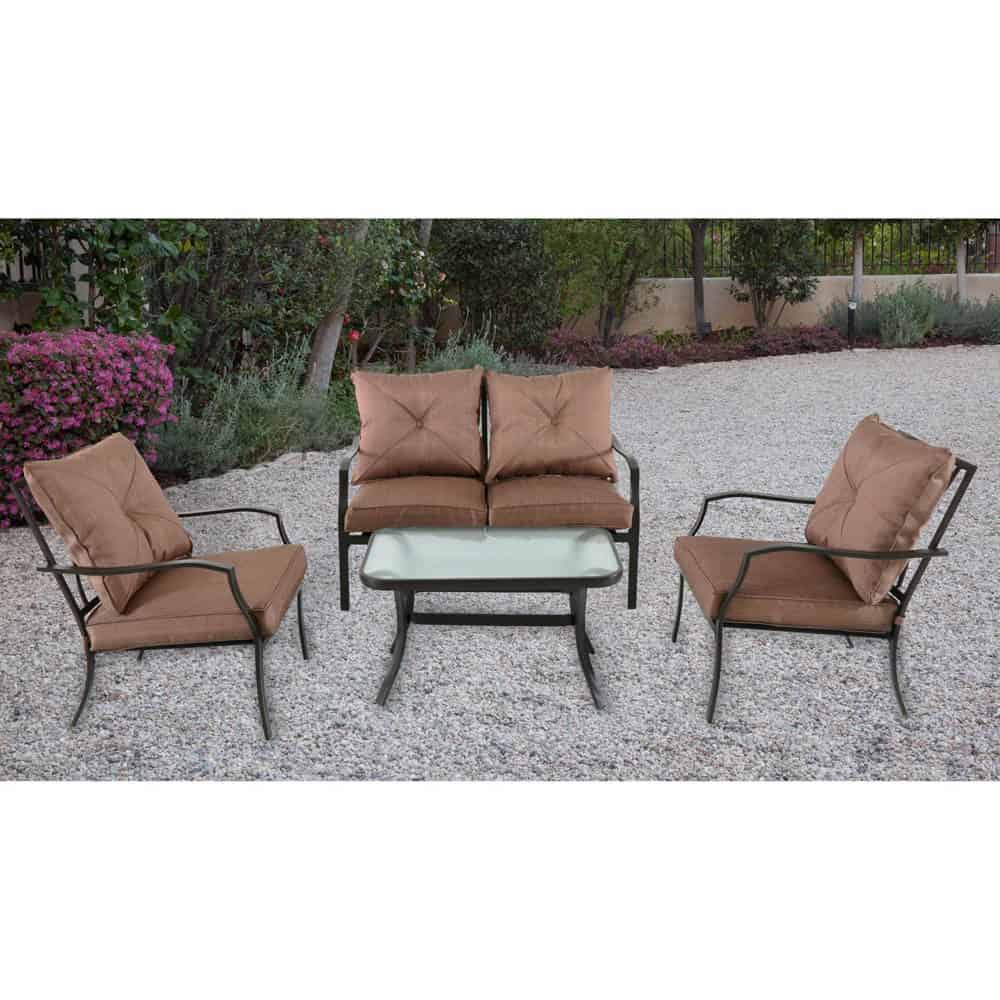 - Set includes one loveseat, two arm chairs, and one glass-top coffee table