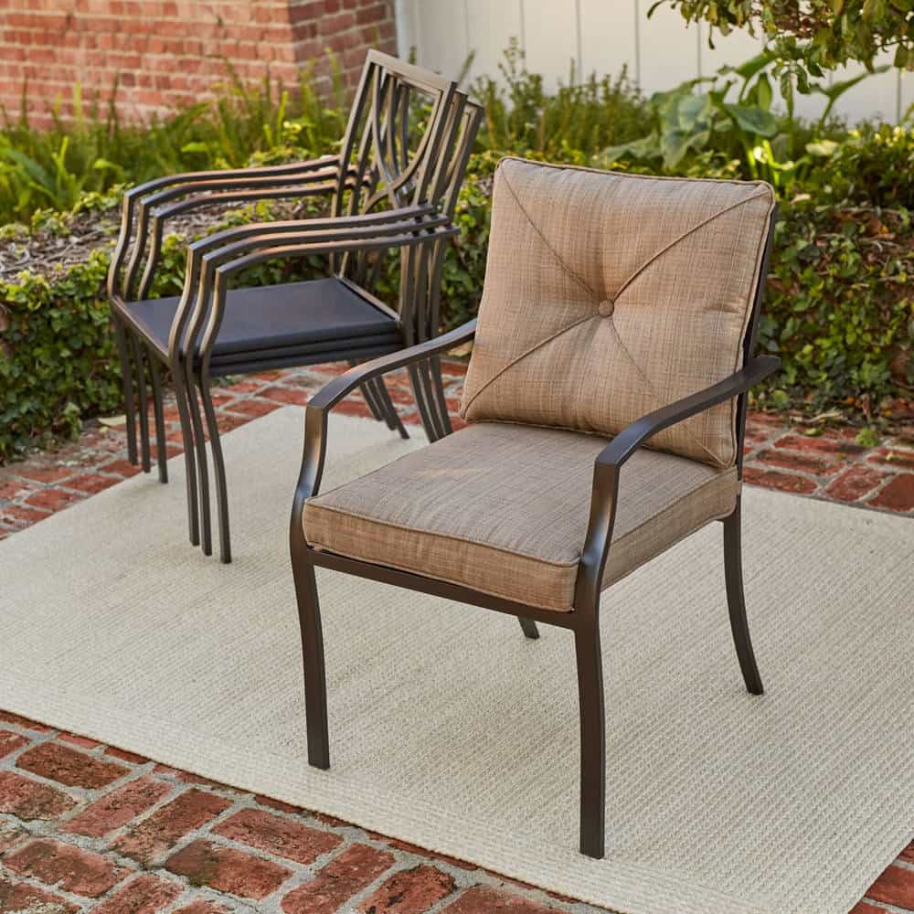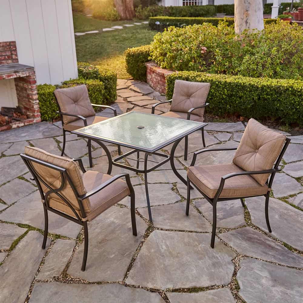 - CLASSIC DESIGN: The Palm Bay Dining Collection by Hanover includes four cushioned dining chairs and a premium tempered glass-top table in this stunning set. Fitted in sophisticated copper and bronze tones, this set will blend seamlessly and stylishly into any backyard , patio, or porch décor scheme.