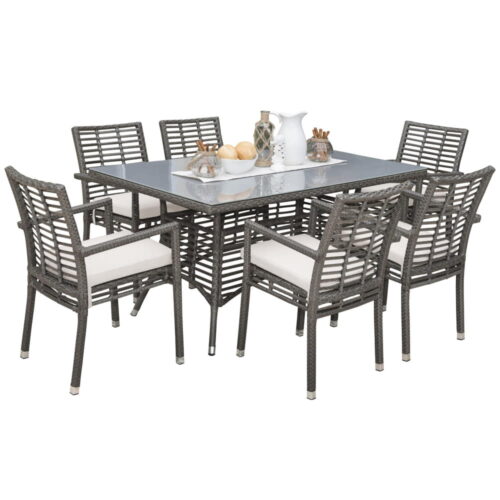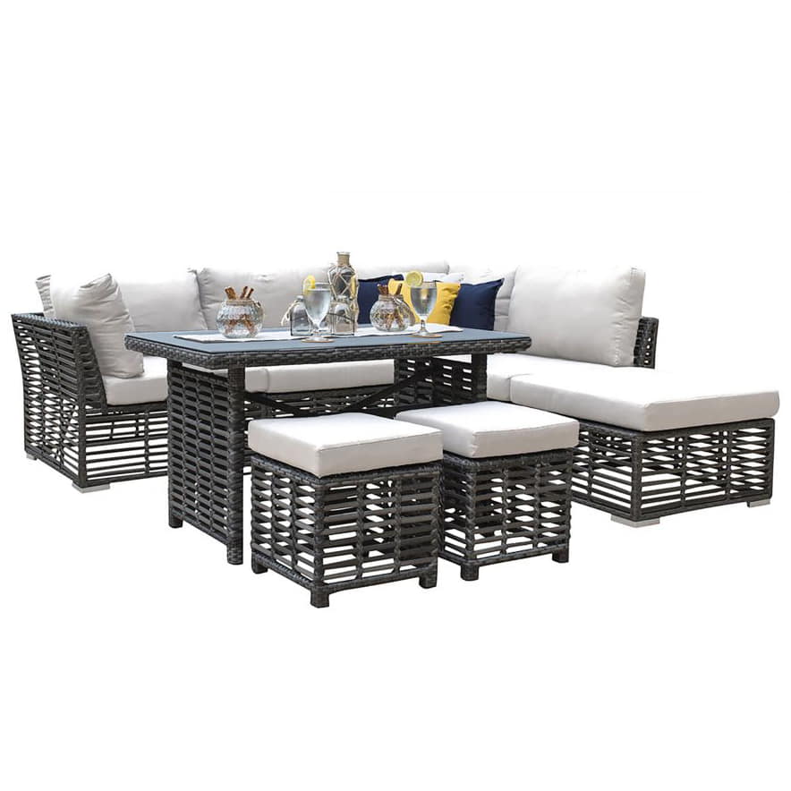 The Panama Jack Graphite 7 Pc. Sectional Set with High Coffee Table is constructed from see-through grey fiber hand woven over aluminum frames, the Panama Jack Graphite collection will bring a sleek and modern look to your backyard or patio. Resistant to corrosion and scratching, this sectional set is ideal for any outdoor living space and can be combined with many other items from the Graphite collection to create an outdoor living area perfectly suited to your needs. Cushions are included in an off-white outdoor polyester fabric or you can choose from one of our many Sunbrella outdoor fabric options. Additionally, the tempered glass is included with the rectangular high coffee table for stress free completion of your hand-picked outdoor living area.