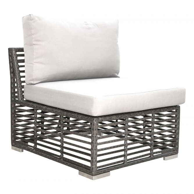 Constructed from see-through grey fiber hand woven over aluminum frames, the Panama Jack Graphite collection will bring a sleek and modern look to your backyard or patio. Resistant to corrosion and scratching, this modular armless chair is ideal for any outdoor living area and can be combined with many other items from the Graphite collection to create the perfect sectional for an outdoor living area specifically suited to your needs. Cushions are included in an off-white outdoor polyester fabric or you can choose from one of our many Sunbrella outdoor fabric options.