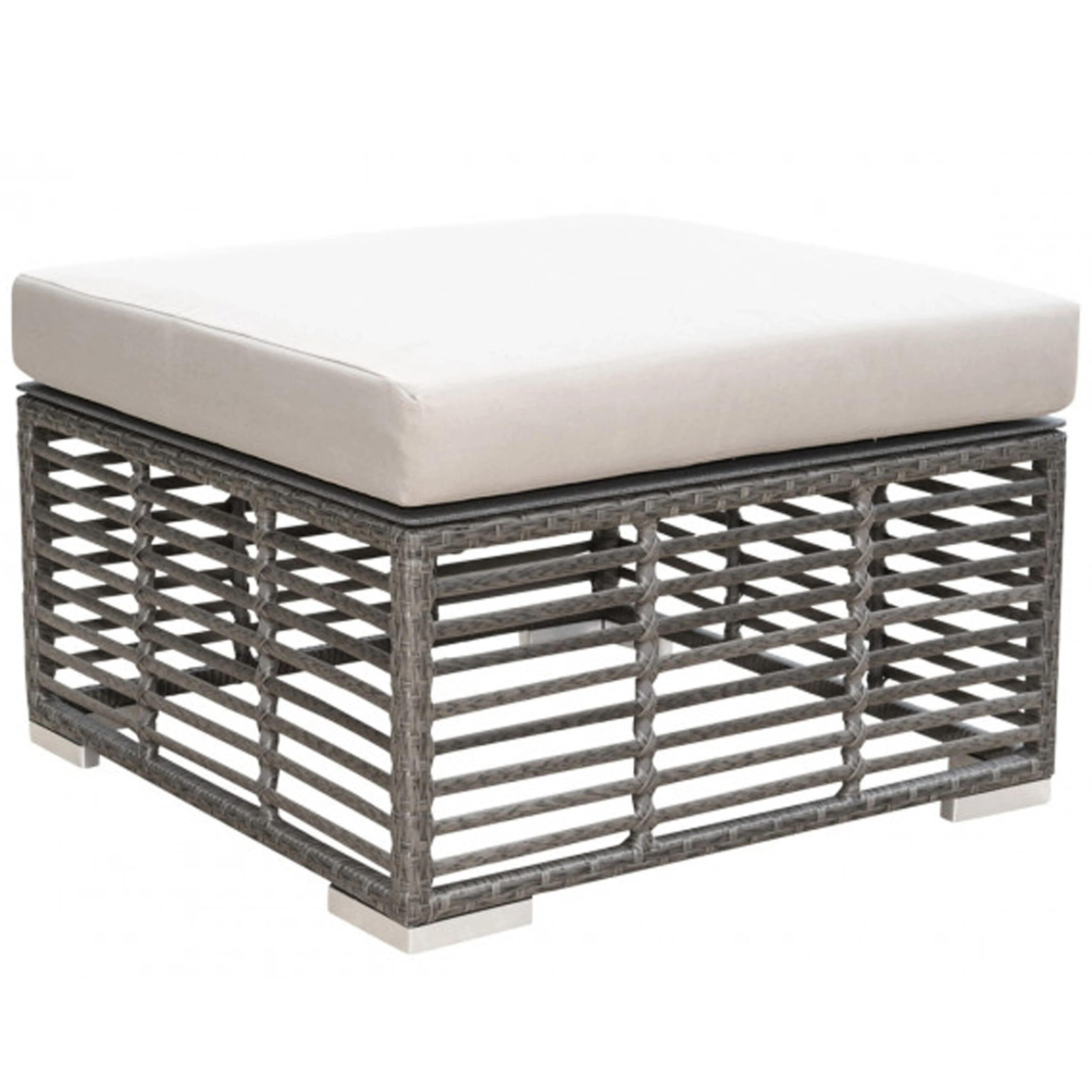 The Panama Jack Graphite collection is a hand crafted outdoor aluminum framed grouping that incorporates a greyish silver large profile HDPE synthetic wicker. Kick up your feet and relax on this this ottoman made of all weather proof fibers with removable cushion. Set the cushion aside and turn the ottoman into a holding table for small belongings. Available in a quick ship standard fabric or choice of upgraded Sunbrella option.