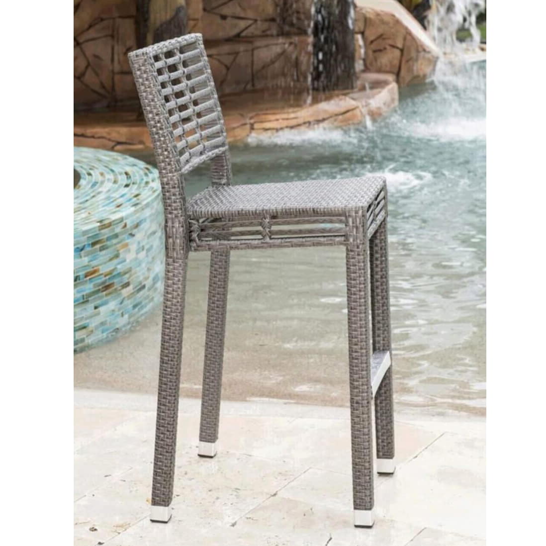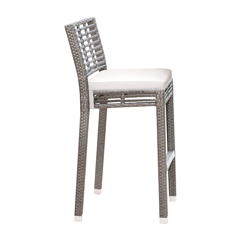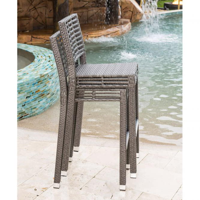 The Panama Jack Graphite collection is a hand crafted outdoor aluminum framed grouping that incorporates a greyish silver large profile HDPE synthetic wicker. Pull up to your outdoor kitchen counter or bar with this cool, lightweight stool which features stacking ability and provides a midback rest. Also equipped with a foot rest for added comfort. Cushions are available and sold separately in a standard factory fabric or Sunbrella fabric.